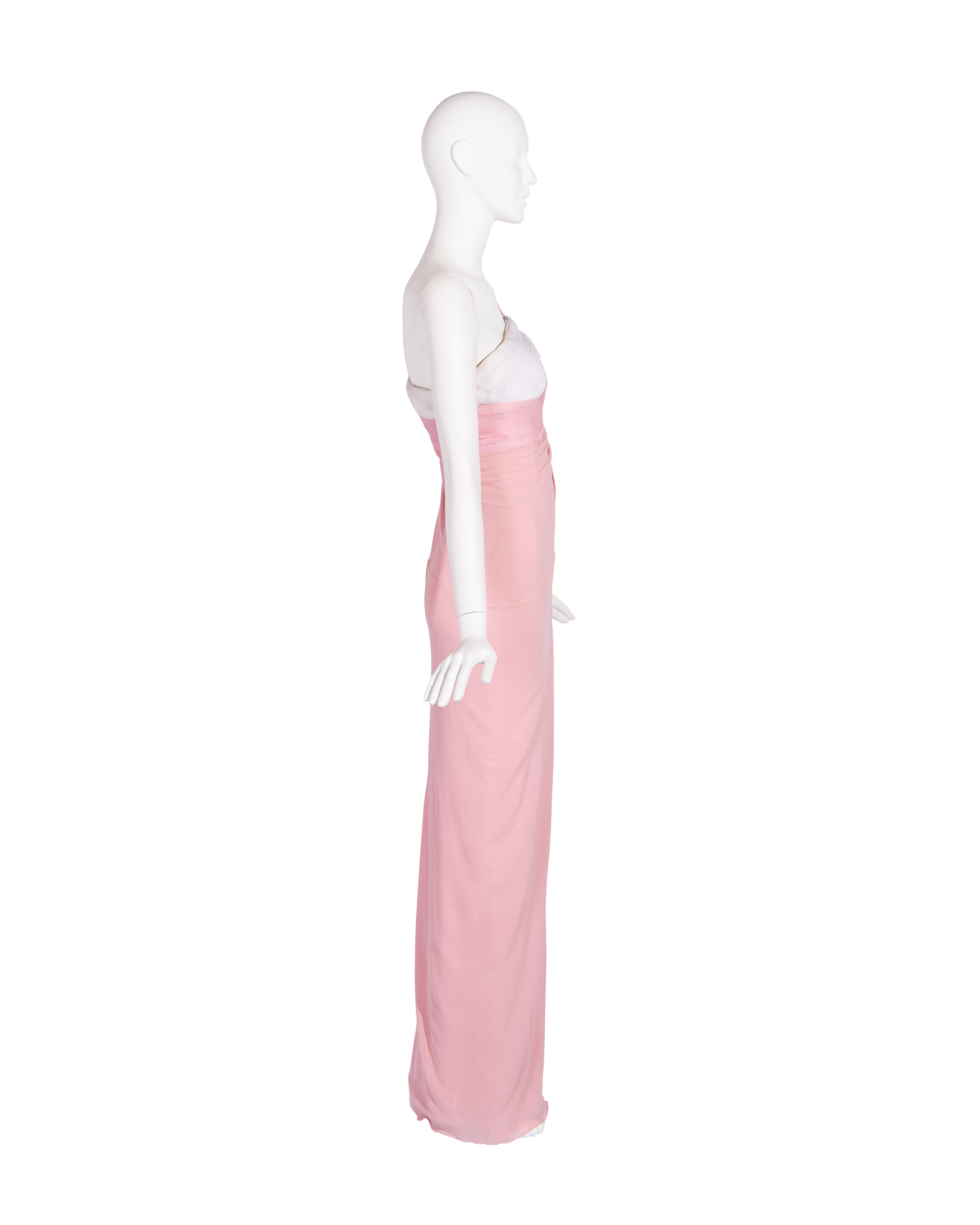S/S 1963 Madame Grès Haute Couture (Attributed) hand-pleated one-shoulder pink and cream silk jersey gown. Extremely rare bi-color Grecian-style drape gown with full skirt and elaborate hand-pleated signature detailing at bust. Built-in corset with boning and concealed side zip closure. Hook-and-eye closure at back strap for ease of try-on. Rare gown as documented in Harper's Bazaar. In very good vintage condition with slight discoloration at pleating consistent with age, faint pen mark at front of chest, and light wear to interior. Corset has been professionally restored by couture tailor.