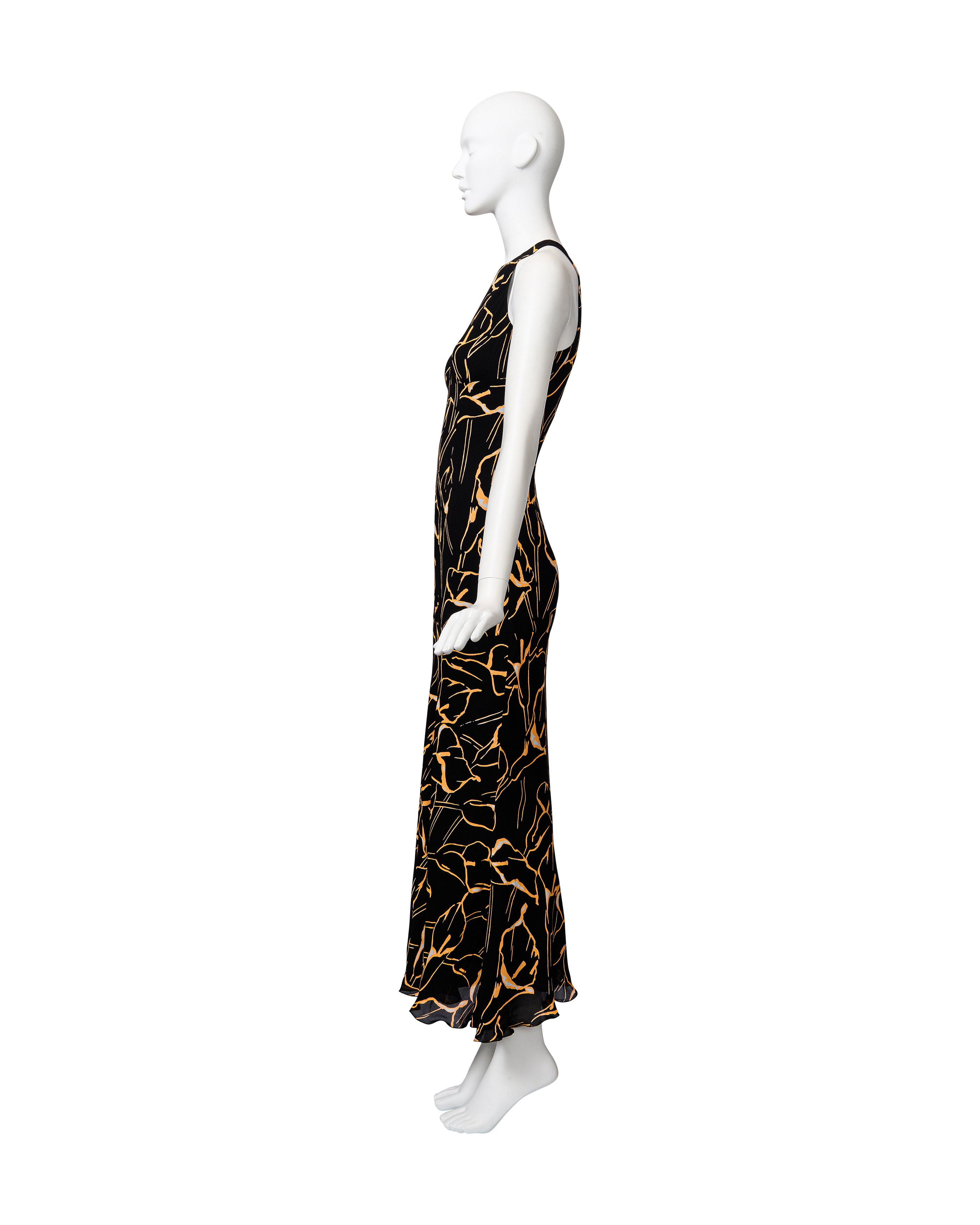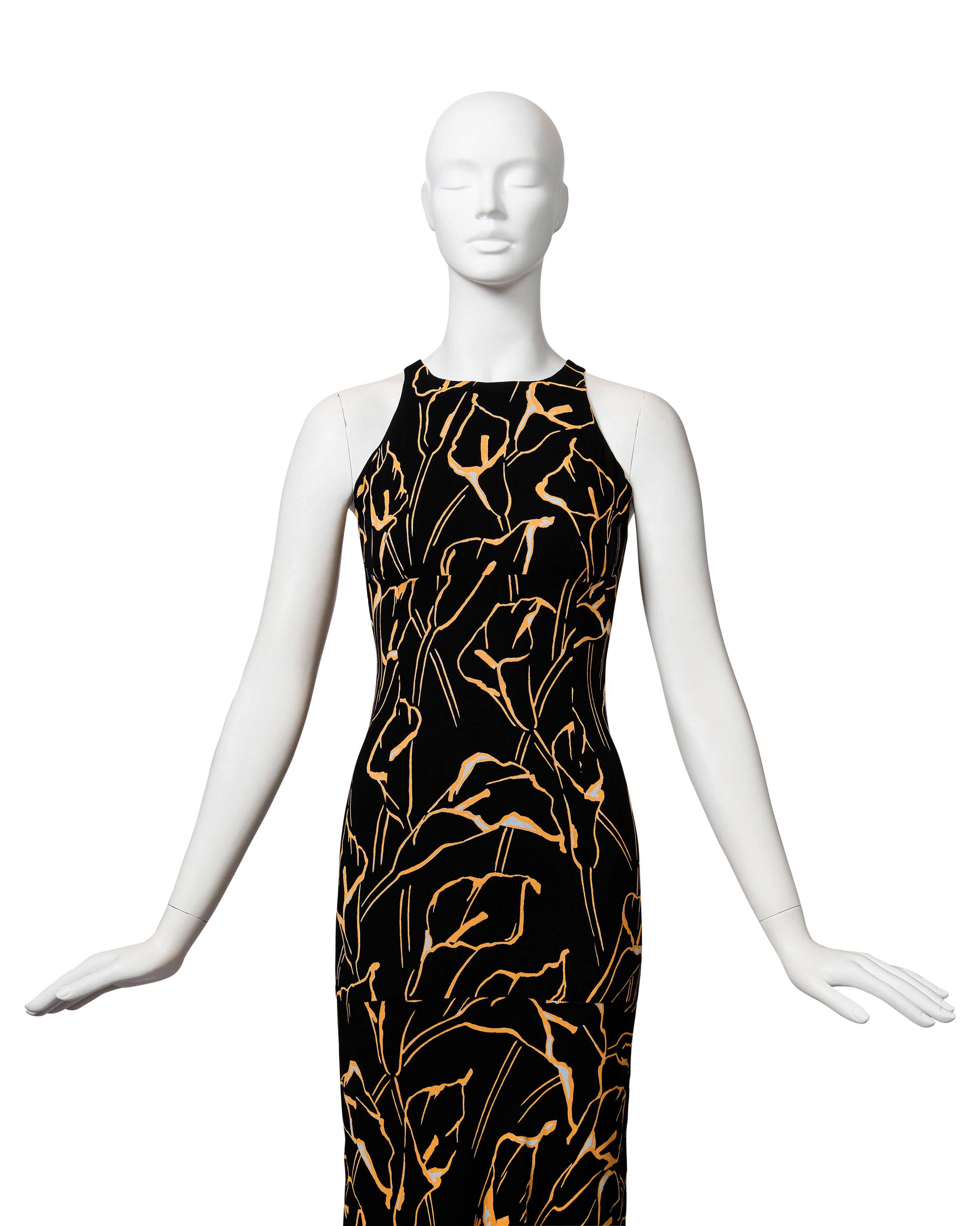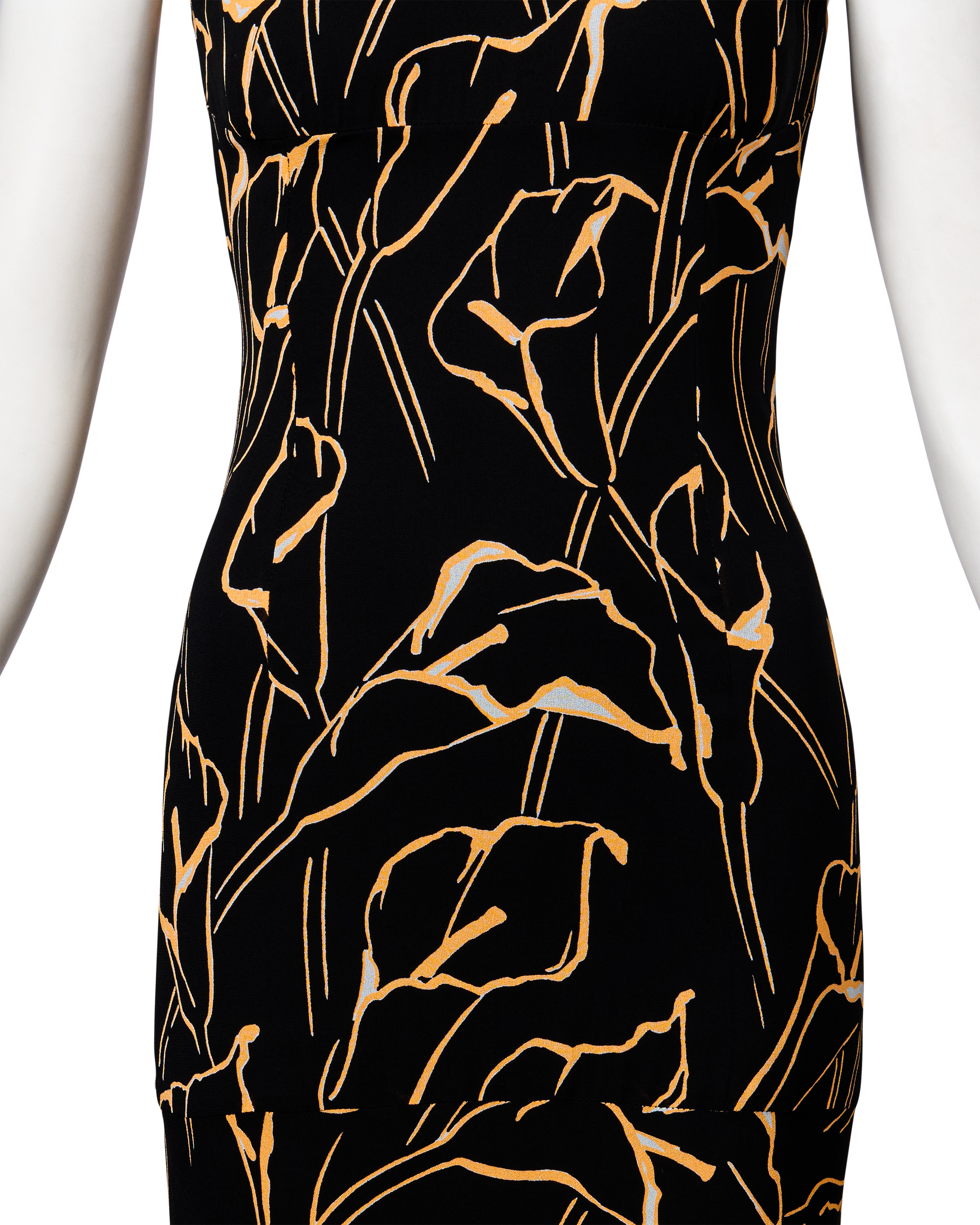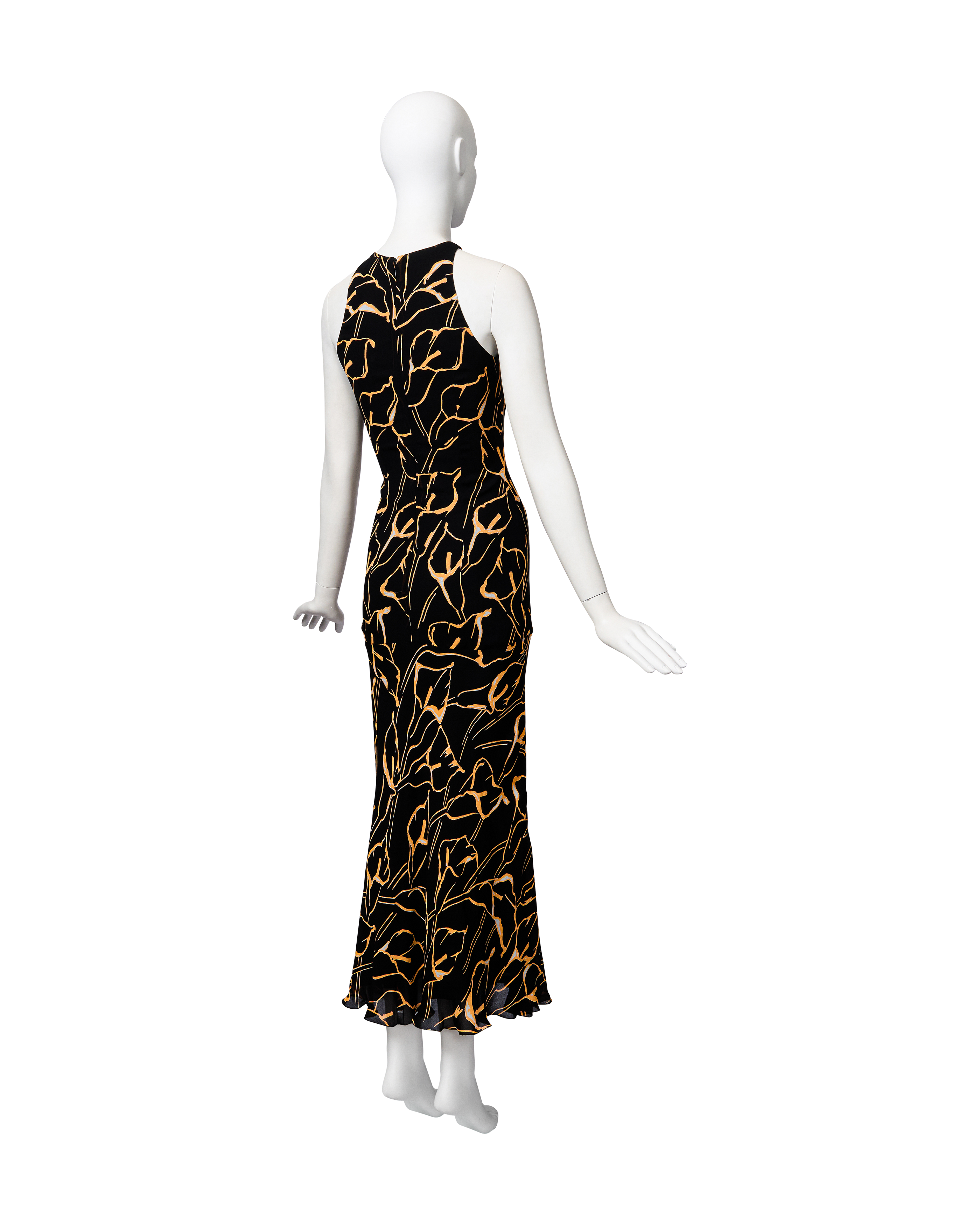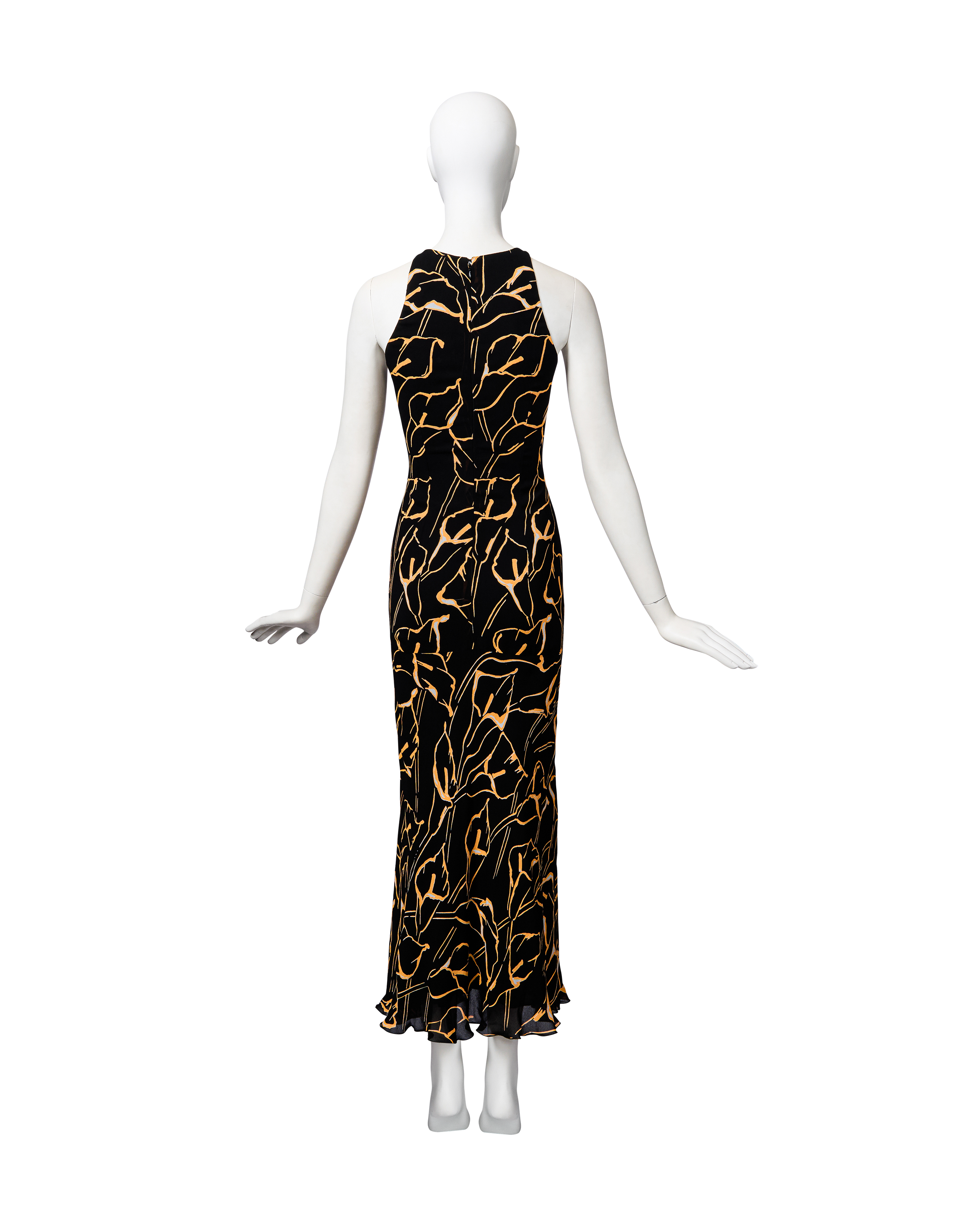S/S 1997 Chloé by Karl Lagerfeld black and yellow-orange coral / calla lily pattern gown. Sleeveless crew neck gown with yellow contrasting coral pattern throughout and ruffle detailing. Fitted sheath dress with concealed back zip closure. Silk crepe ankle length gown with black silk lining. As seen on the runway and featured in the ad campaign, photographed by Paolo Roversi. Rare dress from Karl Lagerfeld's final year of designing for the brand. In very good vintage condition with minor run in back of dress and at front left neckline (undetectable when worn).