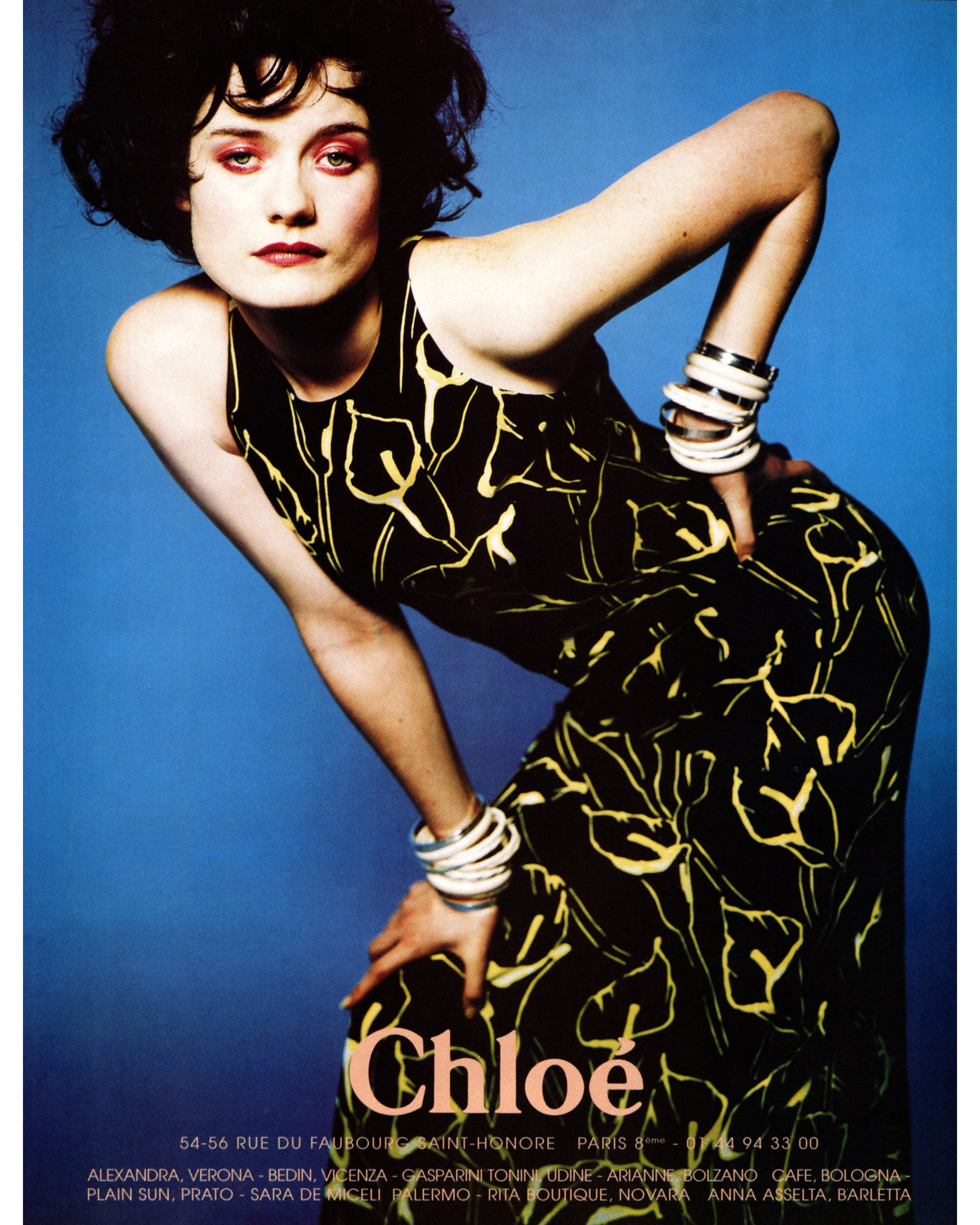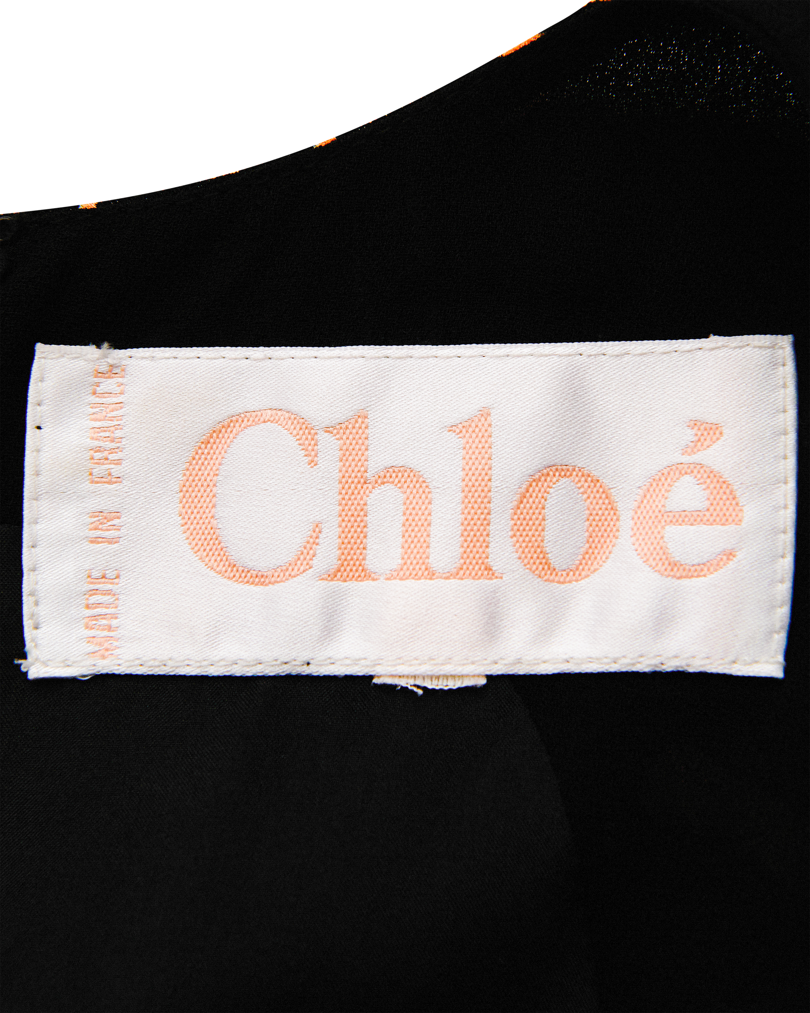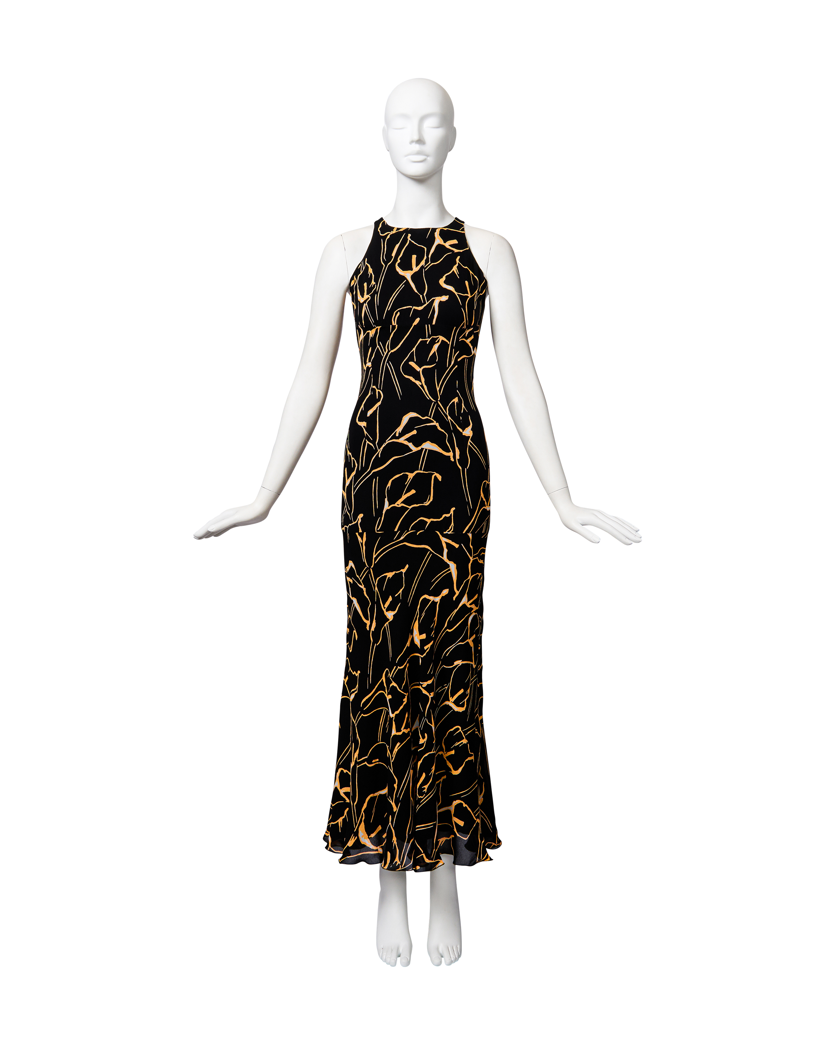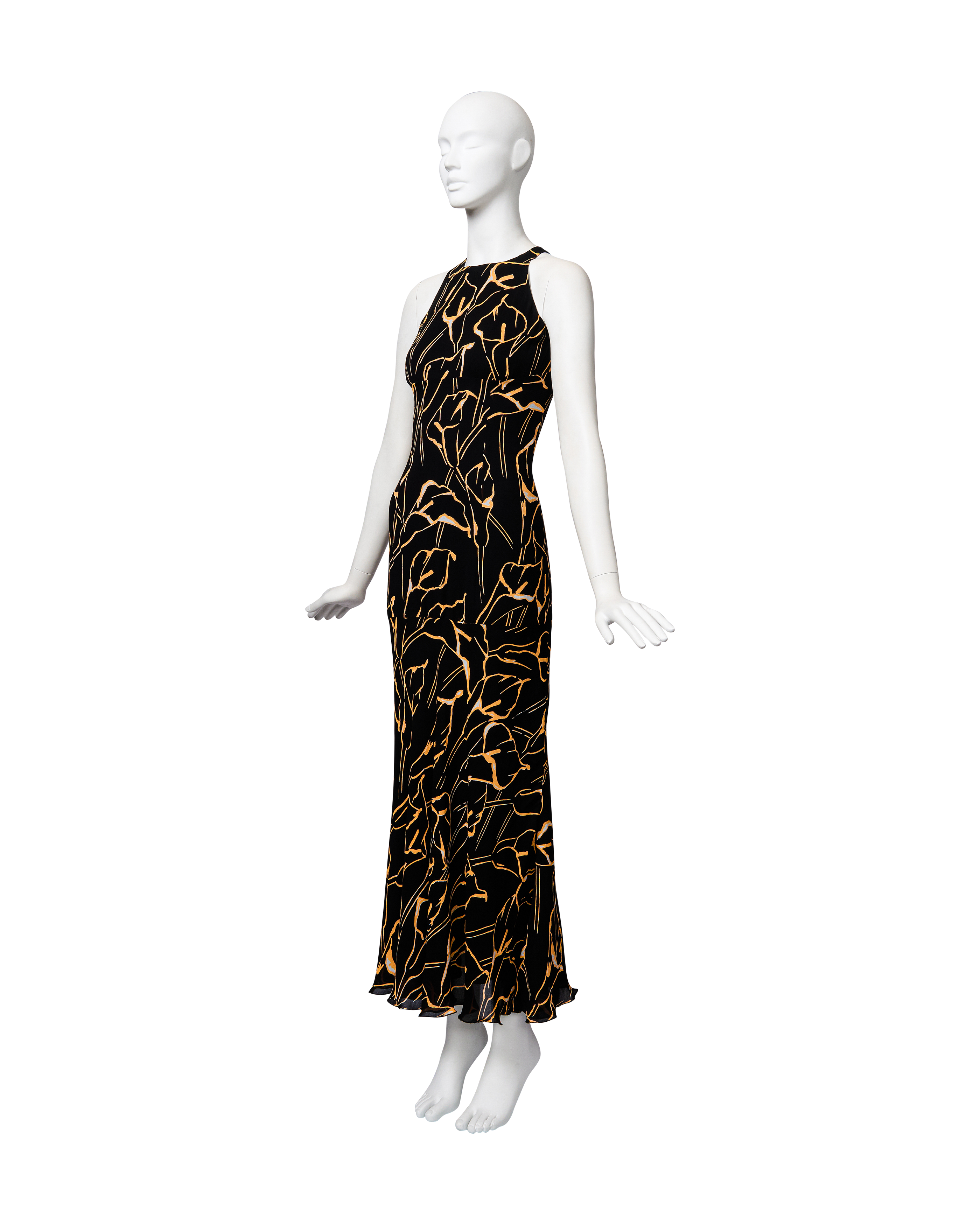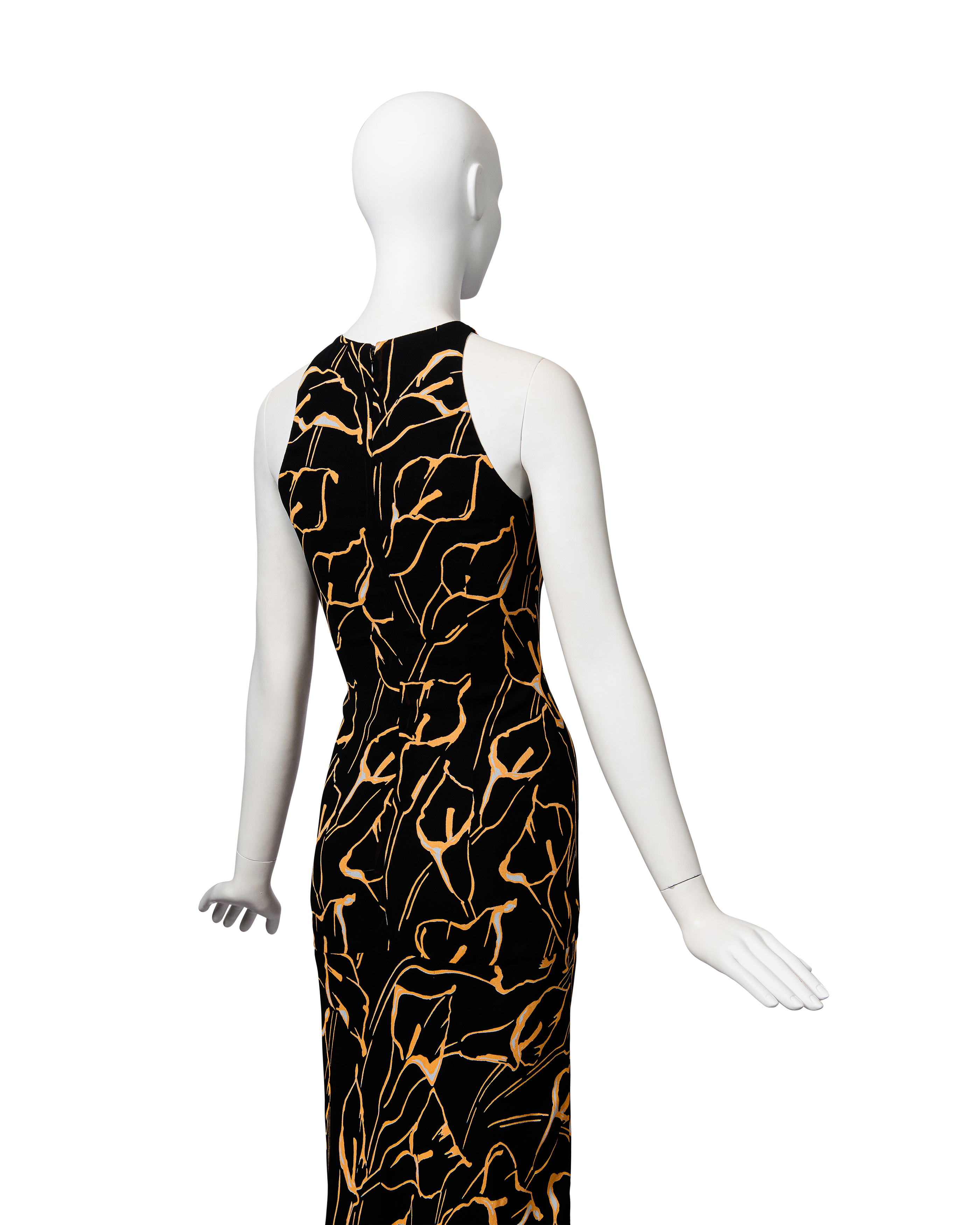 S/S 1997 Chloé by Karl Lagerfeld black and yellow-orange coral / calla lily pattern gown. Sleeveless crew neck gown with yellow contrasting coral pattern throughout and ruffle detailing. Fitted sheath dress with concealed back zip closure. Silk crepe ankle length gown with black silk lining. As seen on the runway and featured in the ad campaign, photographed by Paolo Roversi. Rare dress from Karl Lagerfeld's final year of designing for the brand. In very good vintage condition with minor run in back of dress and at front left neckline (undetectable when worn).