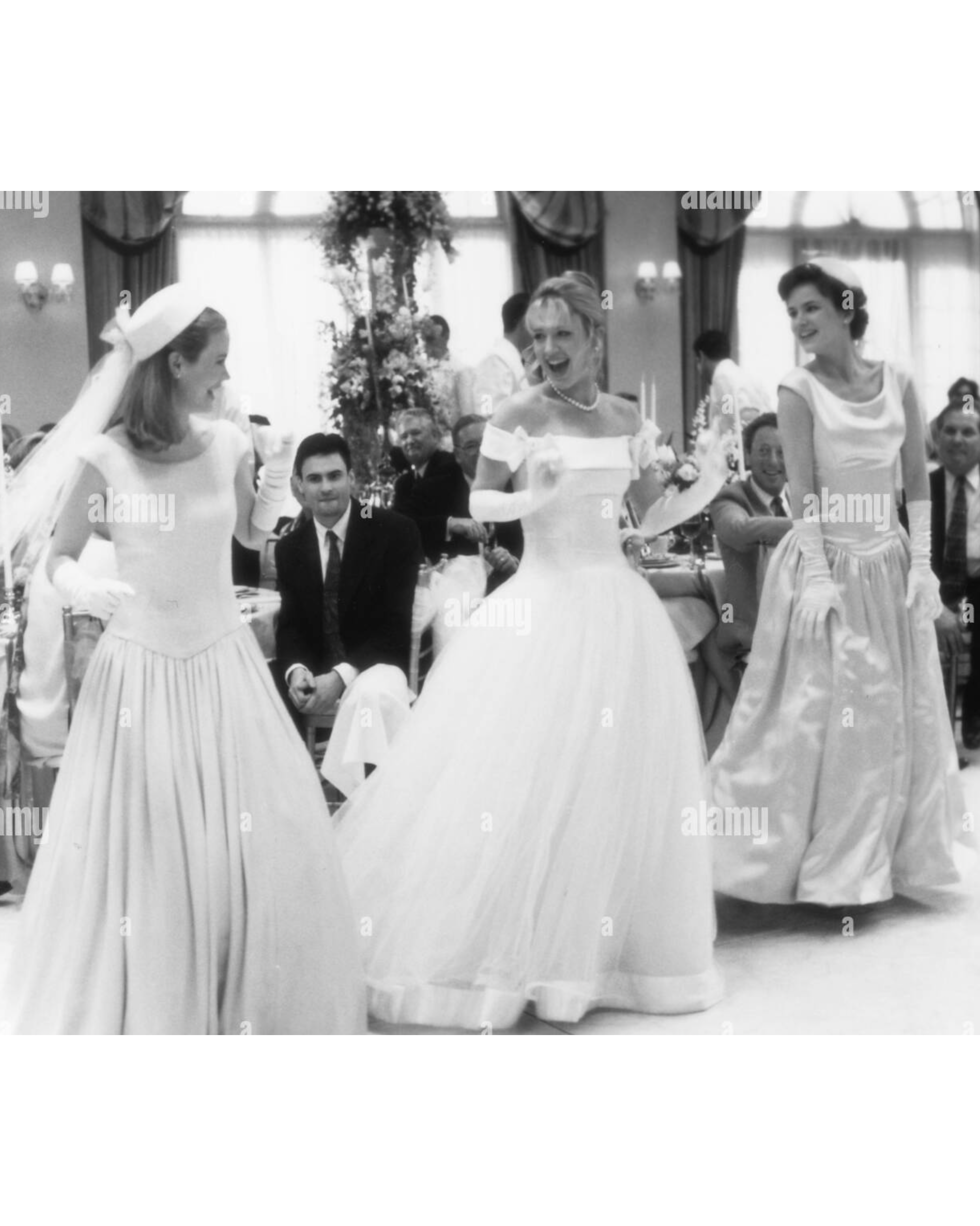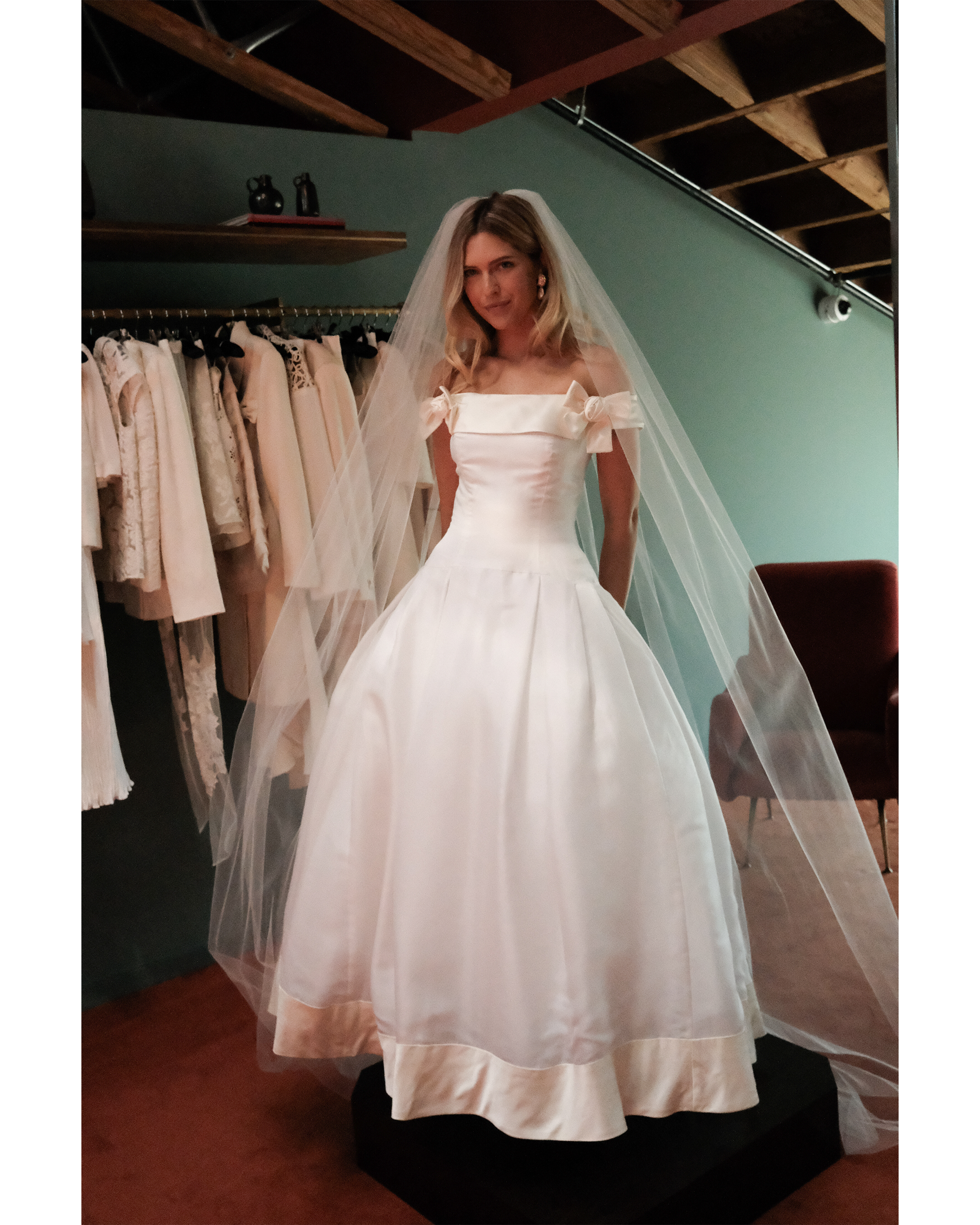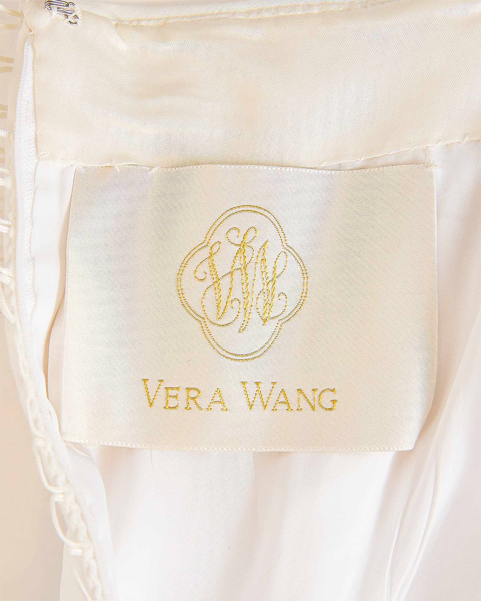 1999 Vera Wang off-shoulder ivory ballgown with ecru bow details. 1930's-inspired fabric button back closures with oversized back bow (featuring rosette at center). Ribbon trim at hemline and built-in button-up bustle at back to allow for ease of wear. Gown features full skirting with multi-layered built-in tulle underskirt. White elastic straps allow for ease of wearing off-shoulder, and can be styled on shoulder as desired. Similar details featured on the runway, in Estee Lauder's campaign, and featured in the movie 'The Other Sister.' In very good vintage condition with very slight wear throughout, including faint 'kiss' shaped mark at lower back skirting (noticeable upon close inspection).