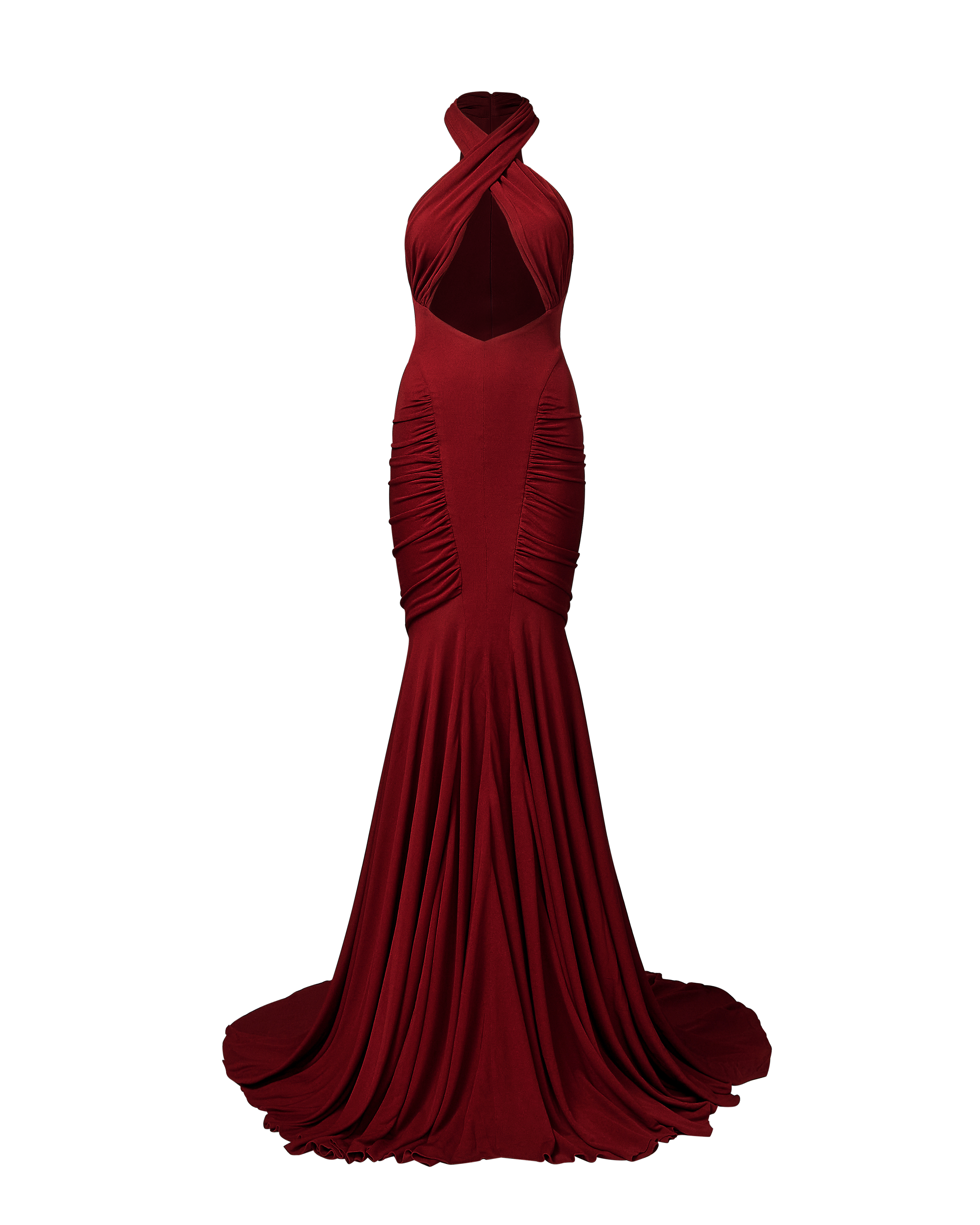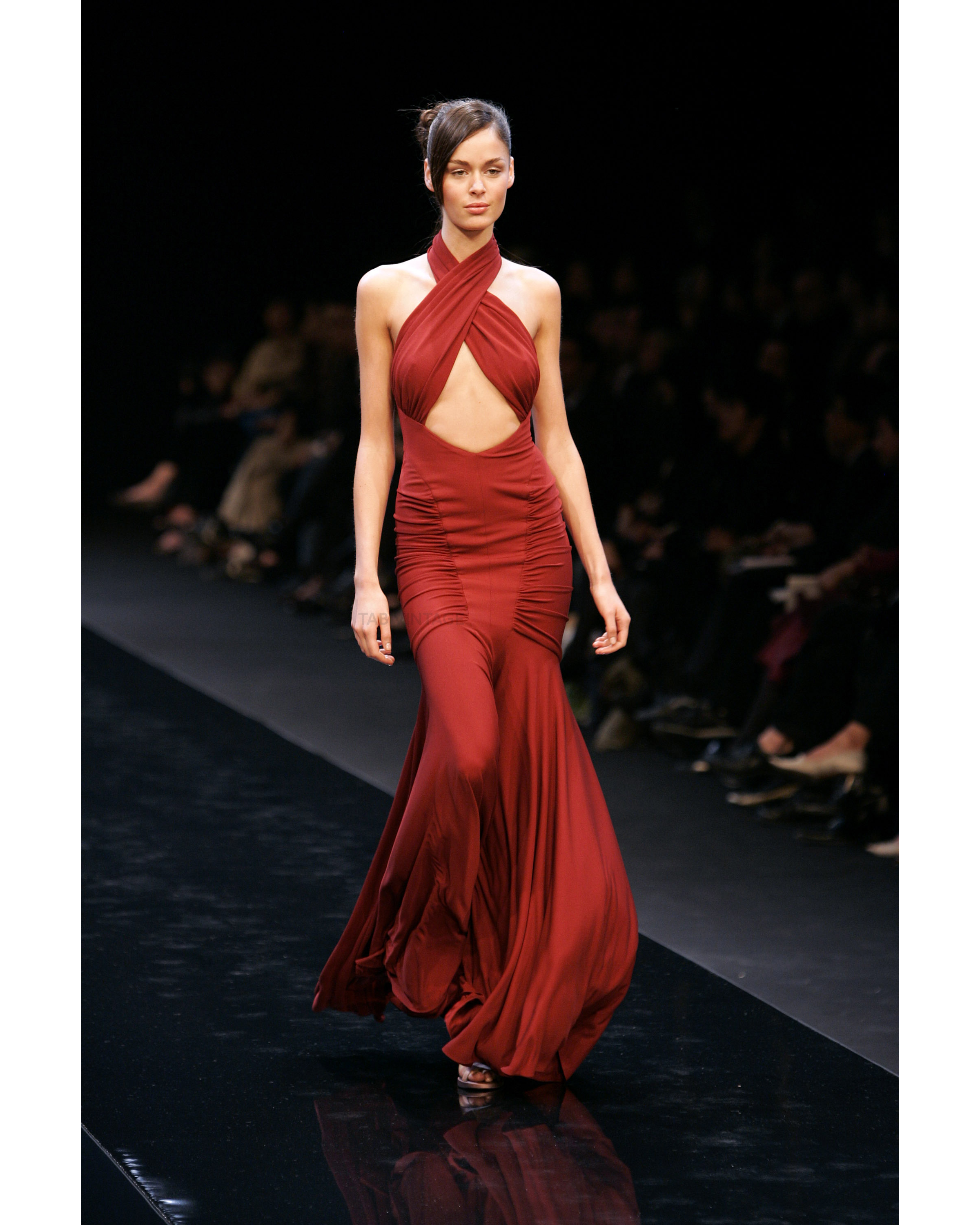 S/S 2005 Guy Laroche red cutout jersey trained gown. Fitted deep red gown with ruched side construction and cross-front gathered bust, featuring cutout detailing at midriff. Full, flared skirt with train. Center back zip closure and hook-and-eye closures at nape of neck. Fabric contents unmarked; feels like moderately heavy jersey with slight stretch throughout. Rare gown as seen on the runway. In excellent vintage condition with no flaws to note.