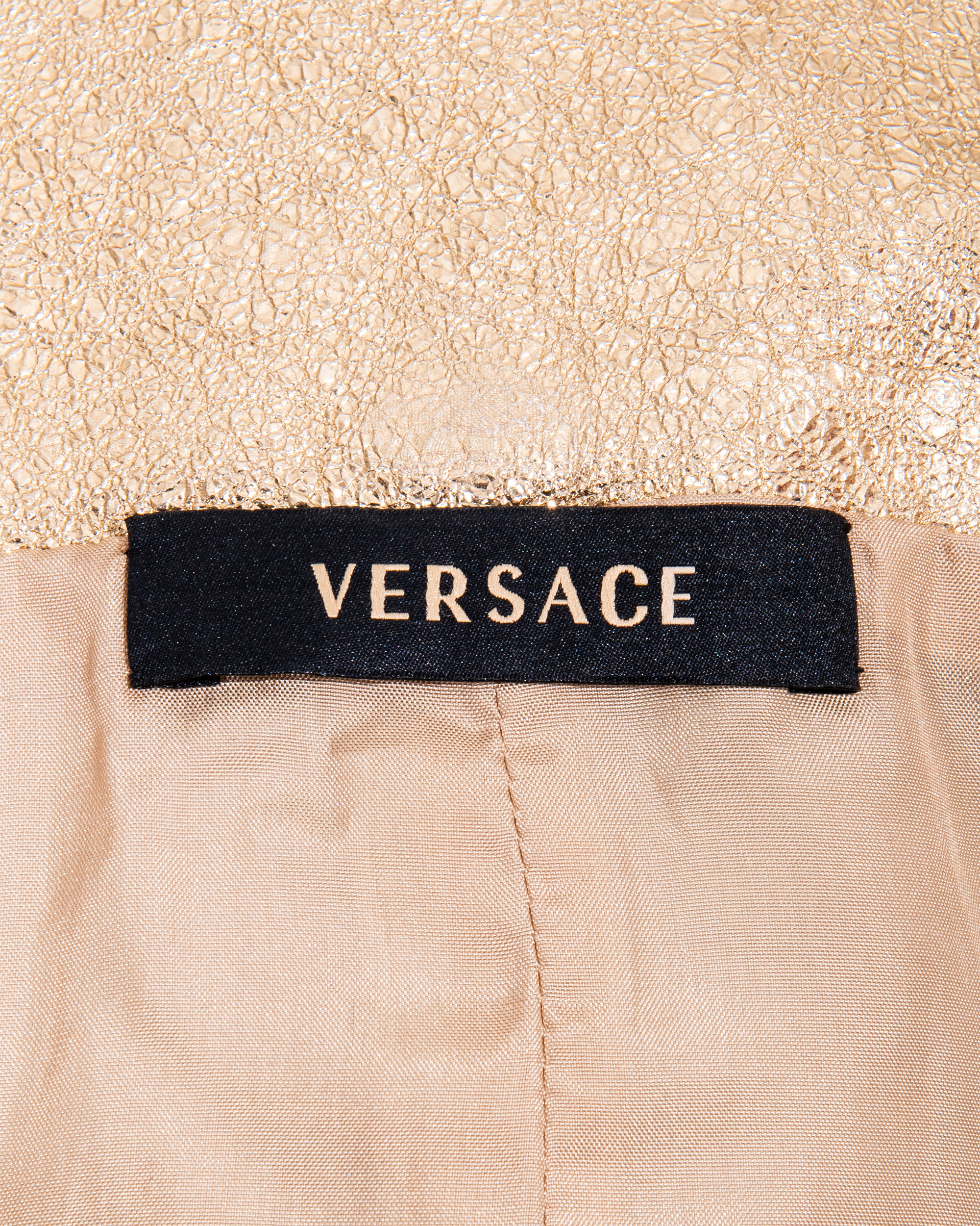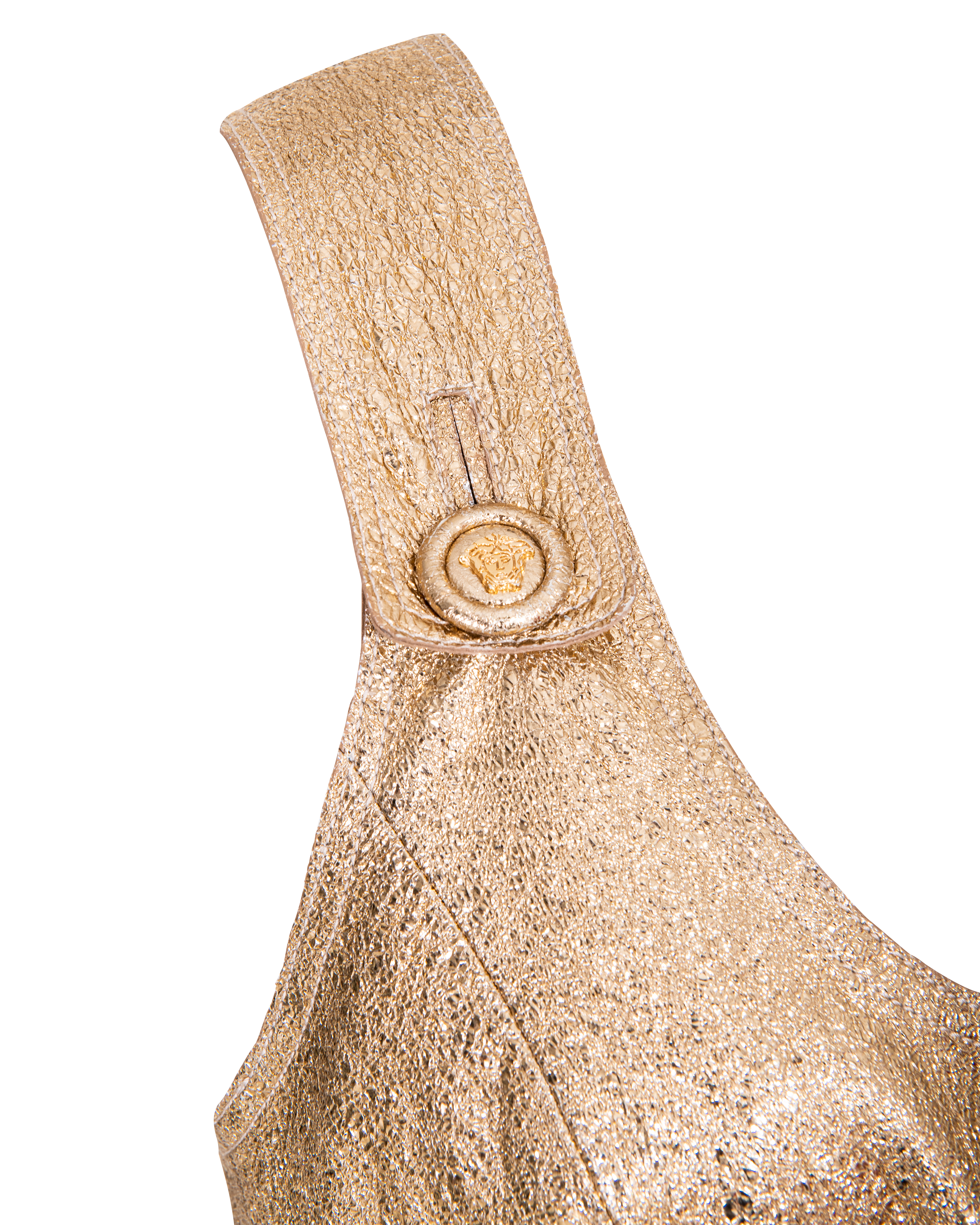 S/S 2007 Versace metallic gold leather overall motif mini dress. Sleeveless textured metallic gold mini dress with scoop neck and 'overall' Medusa button straps and slit pocket details under bust. Lower is lined with deep taupe silk lining. Concealed side zip closure. As seen on the runway. In excellent vintage condition with no flaws to note.