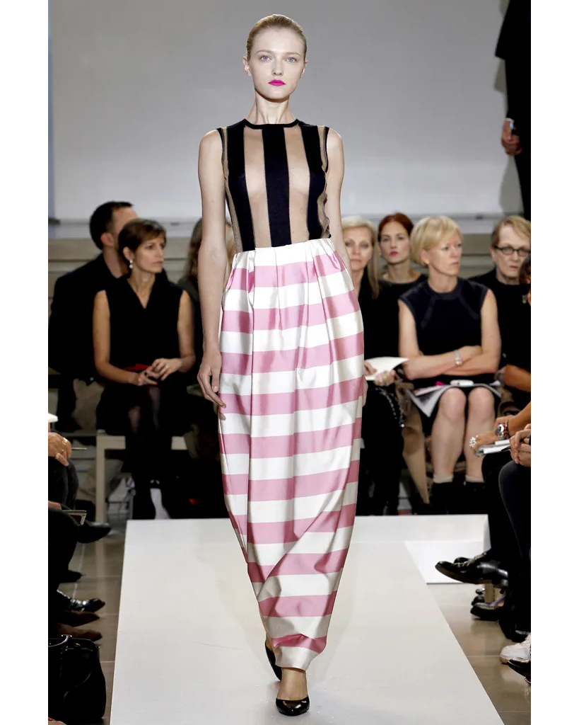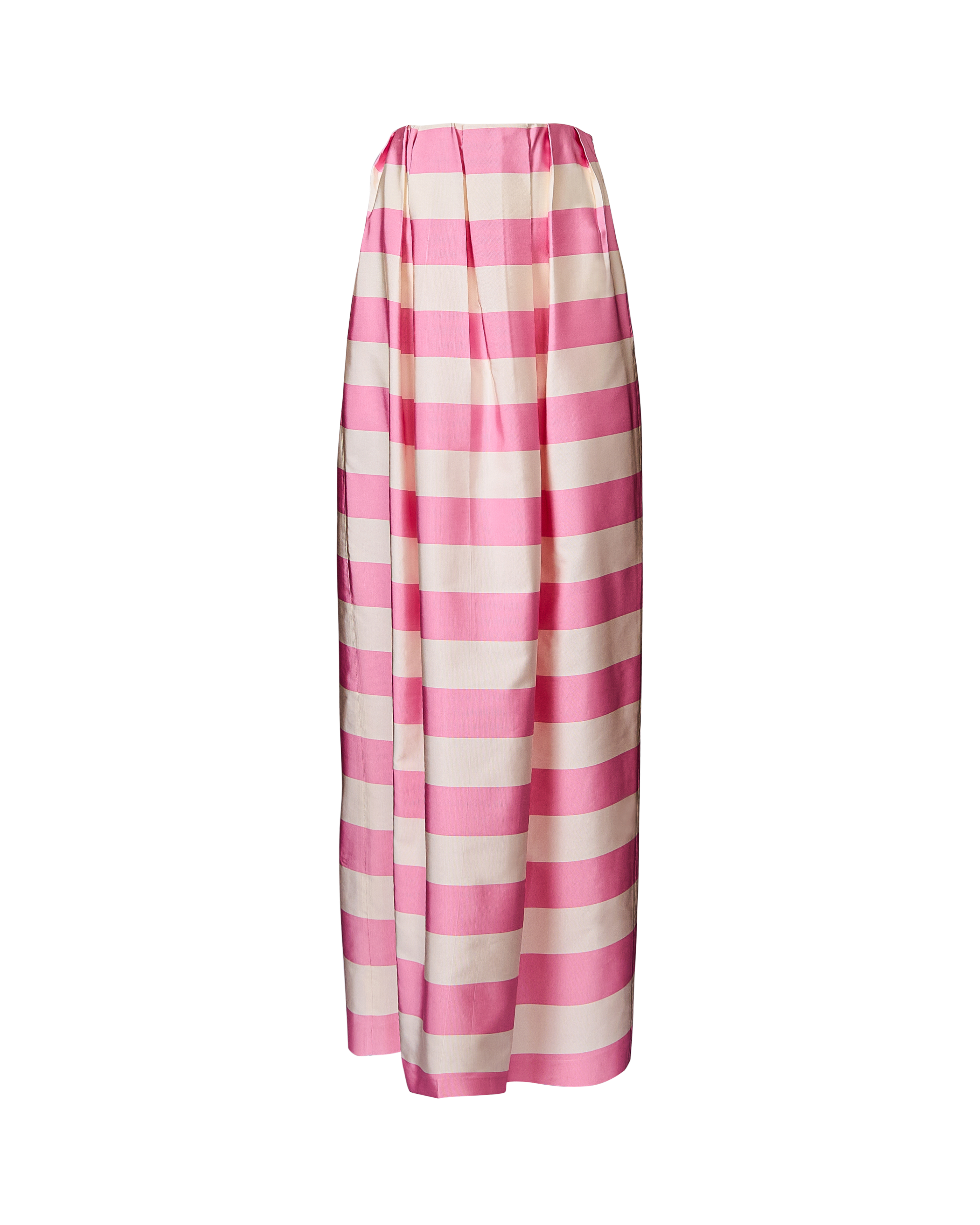 S/S 2011 Jil Sander by Raf Simons pink and white striped maxi skirt. Features raised pleated detailing at waist that creates additional volume when worn. Concealed side zip closure. Fabric Contents: 60% Silk and 40% Cotton blend. As seen on the runway (Look #9). In very good vintage condition with light wear throughout; has been taken to couture cleaner and arrives ready to wear.