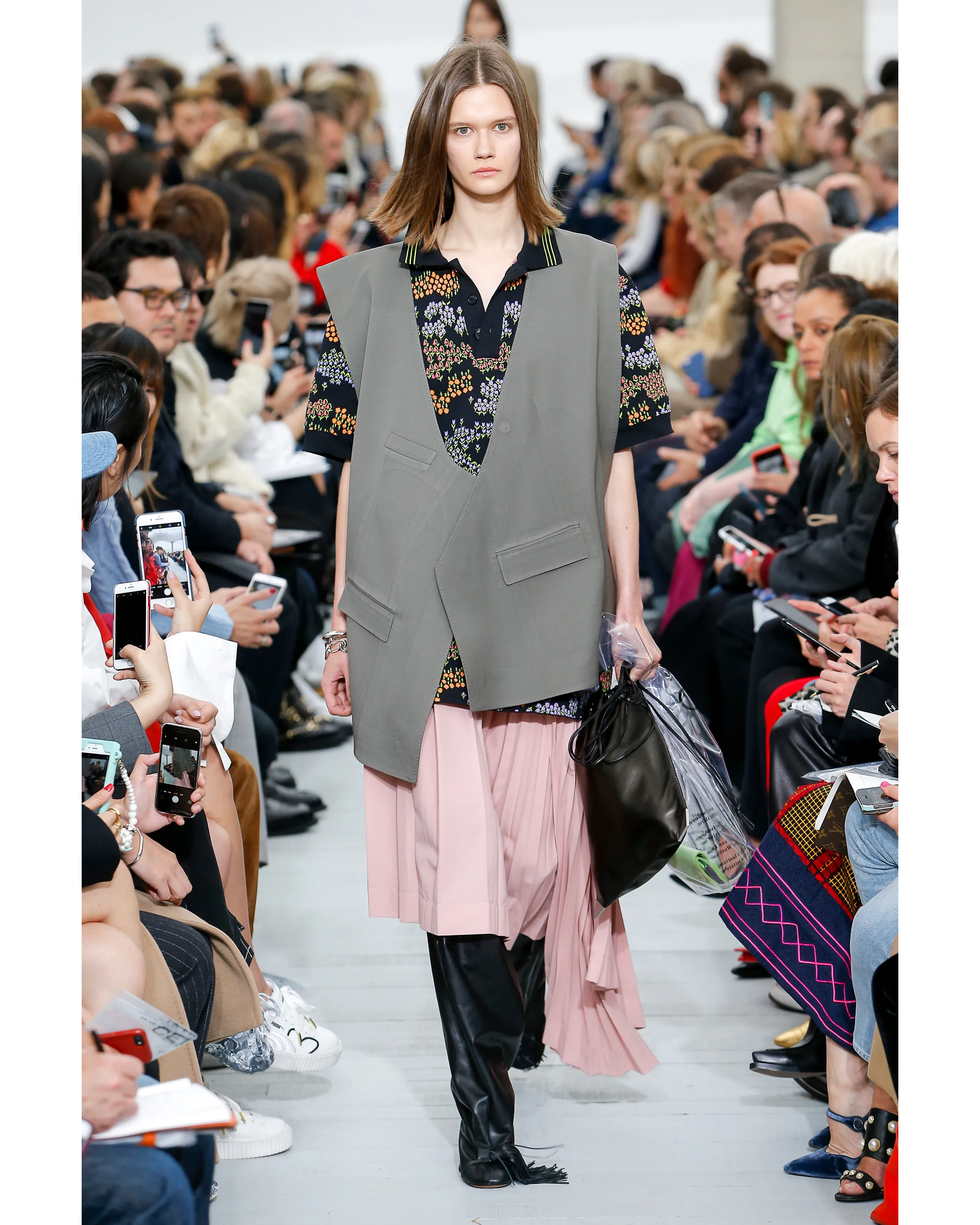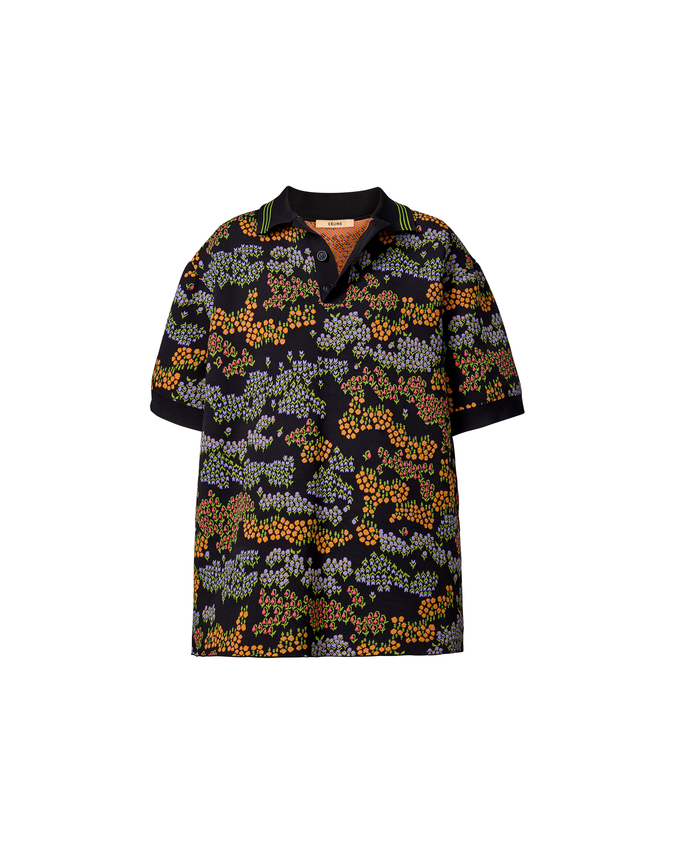 S/S 2018 Céline by Phoebe Philo (Old Céline) black floral pattern polo top. Neutral short sleeve oversized polo top with orange, light blue and green floral pattern throughout. Features button-up collar and green stripe patterning at collar and three front black button closures. Fabric Contents: 100% Polyamide. As seen on the runway (Look #8) on Daniela Kocianova and featured in the lookbook. In very good vintage condition with moderate discoloration at crease of collar (faintly visible when worn).