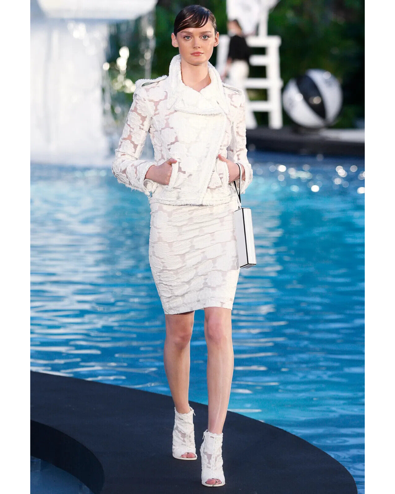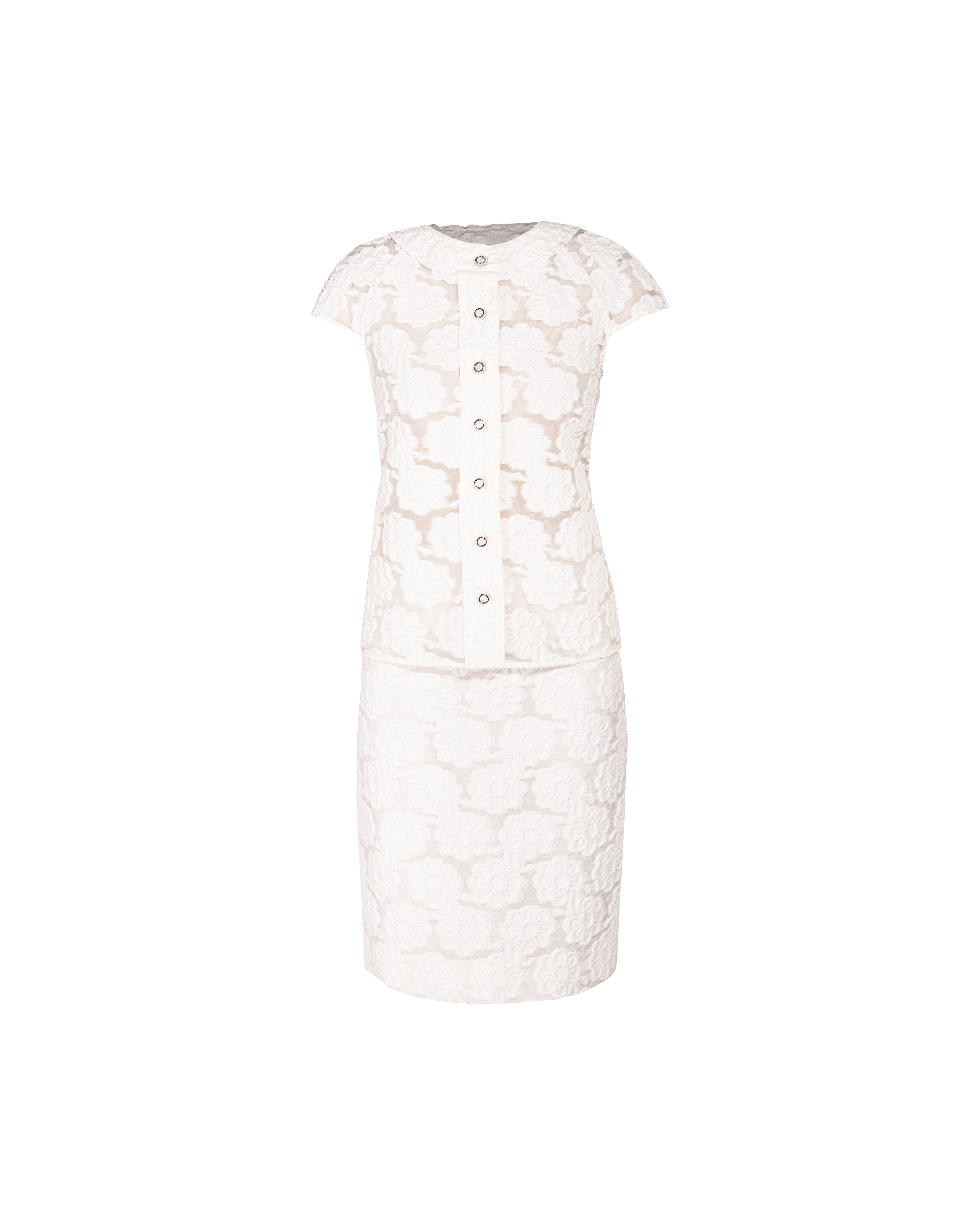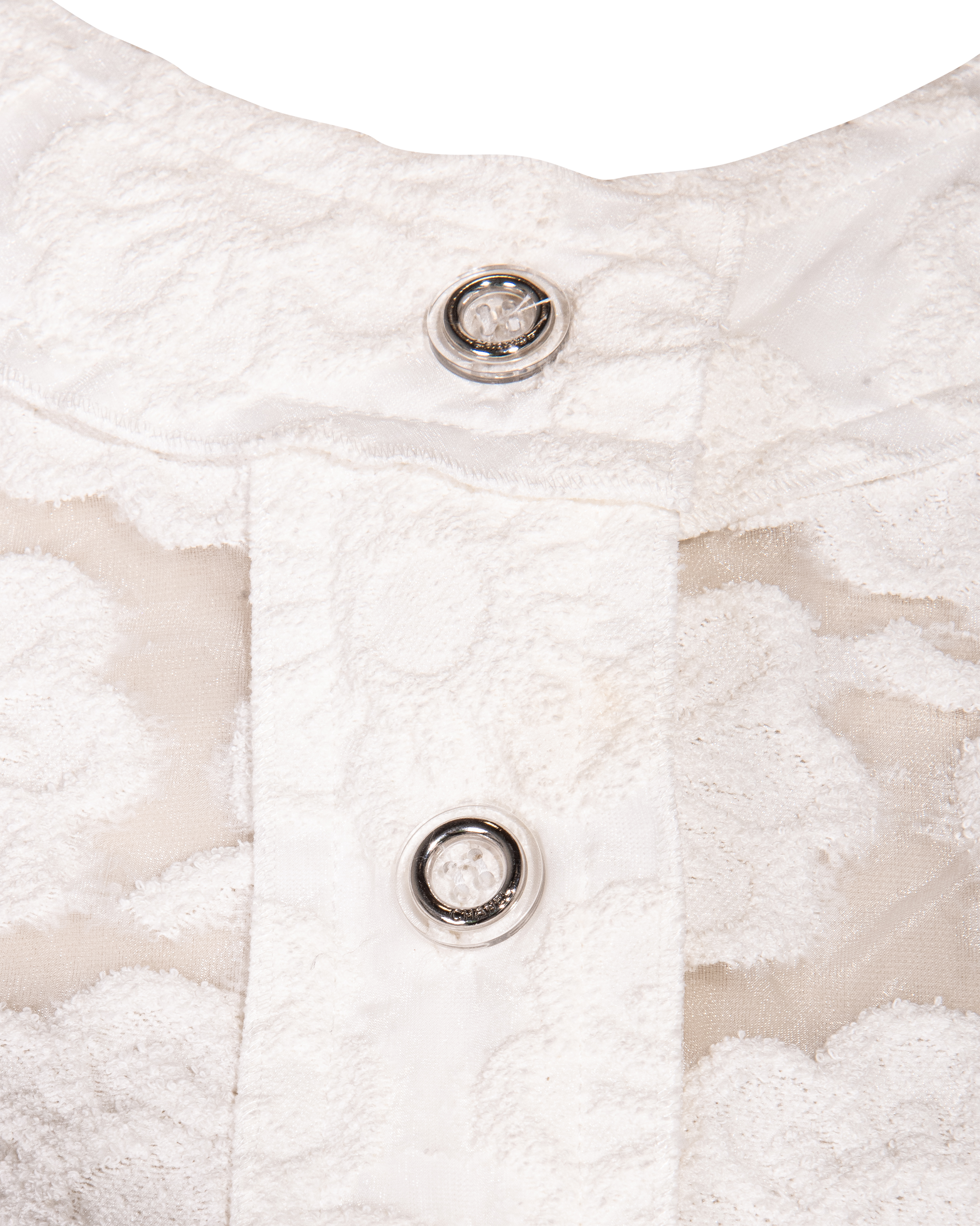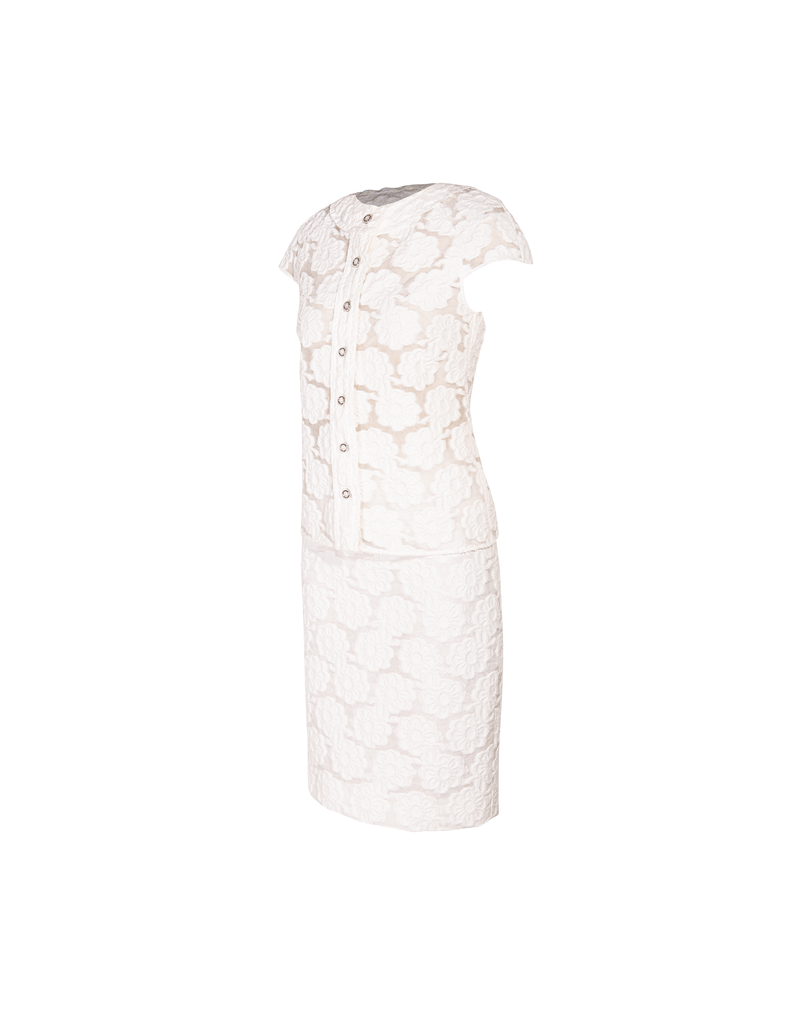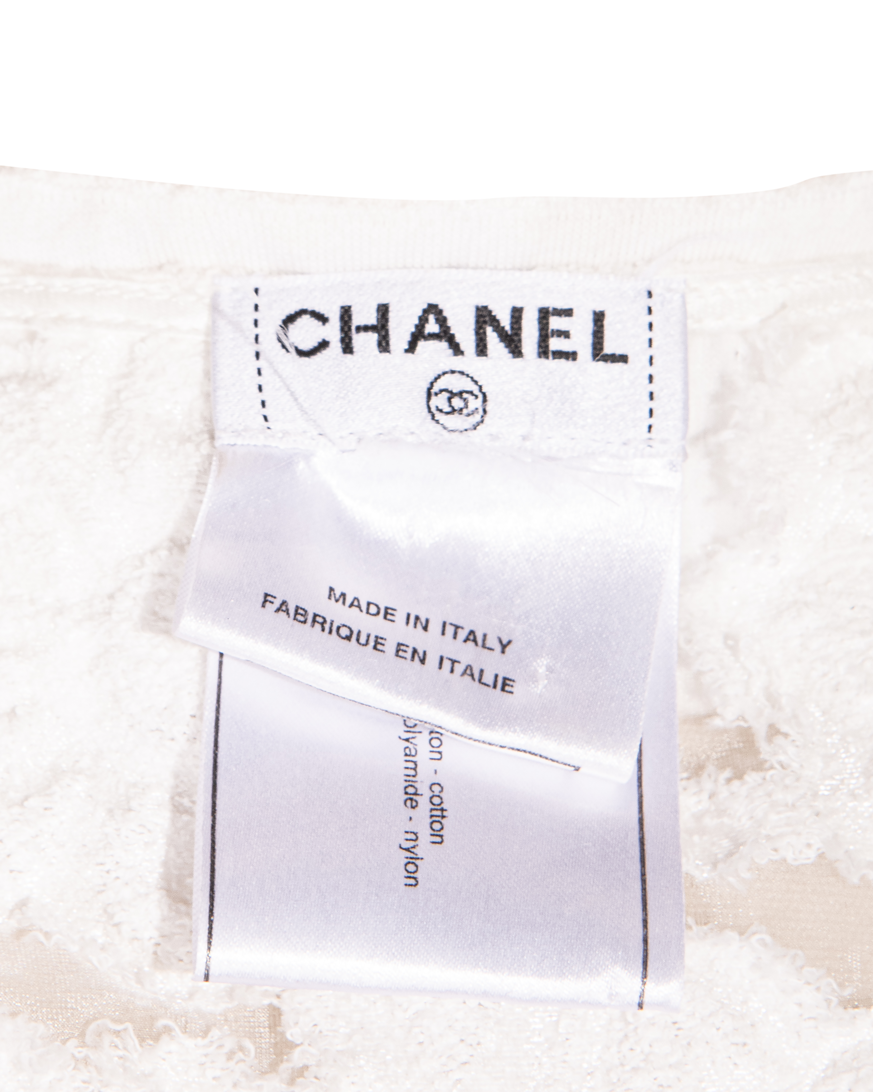 Resort 2009 Chanel by Karl Lagerfeld white camellia floral pattern skirt set. Semi-sheer voided Cotton off-white blend terry cloth with signature Camellia flower pattern throughout skirt and blouse. Cap sleeve button-up blouse features silver-tone circular stamped button closures. Skirt is classic straight style with 'CC' stamped concealed back zip closure. Fabric Contents: 52% Cotton and 48% Nylon blend. Skirt is lined with 100% Silk lining; top is unlined. As seen on the runway (Look 14). In very good vintage condition with light wear throughout, including minor spots near bust and very slight spots throughout sides (not noticeable when worn). Has been taken to couture cleaner and arrives ready to wear.