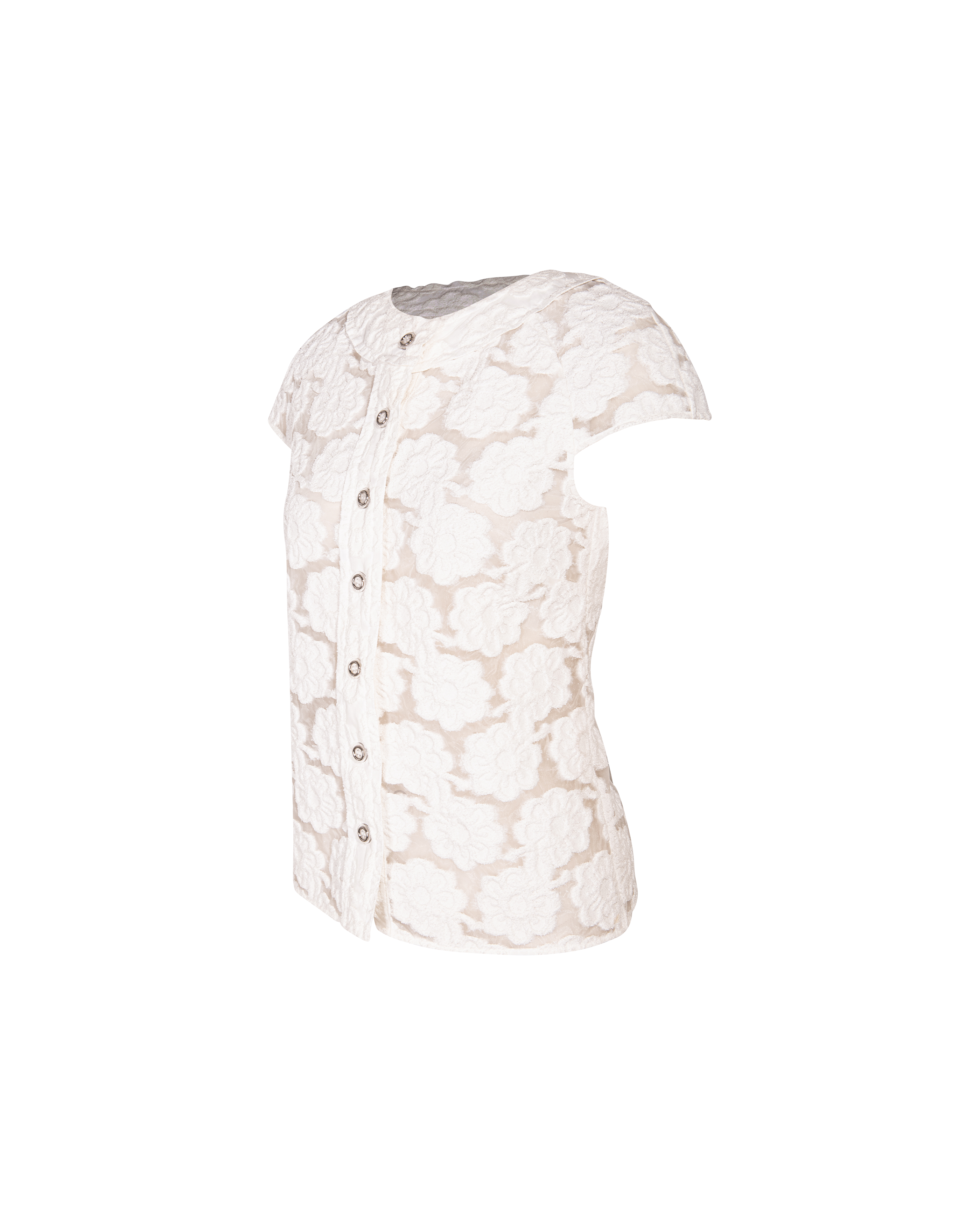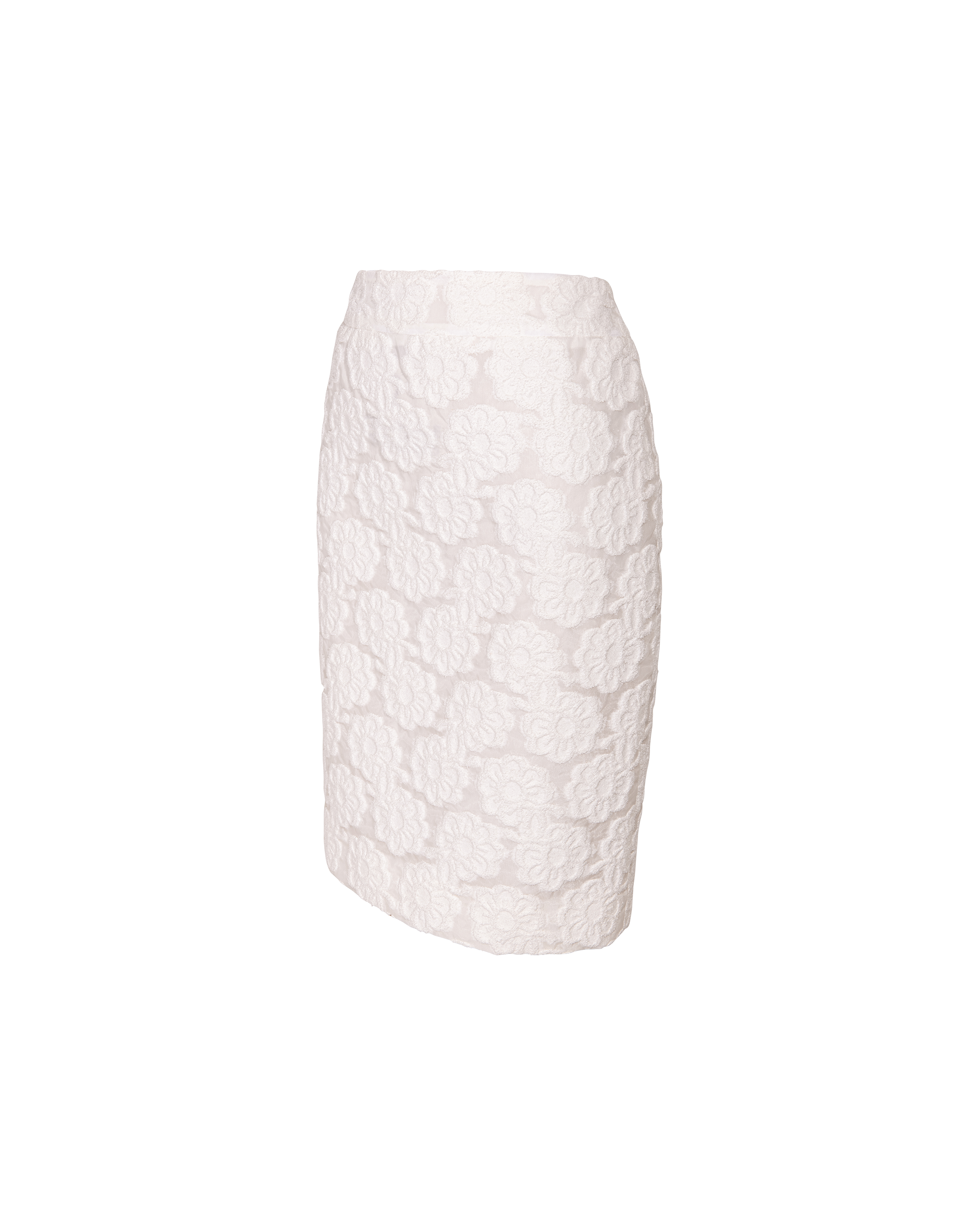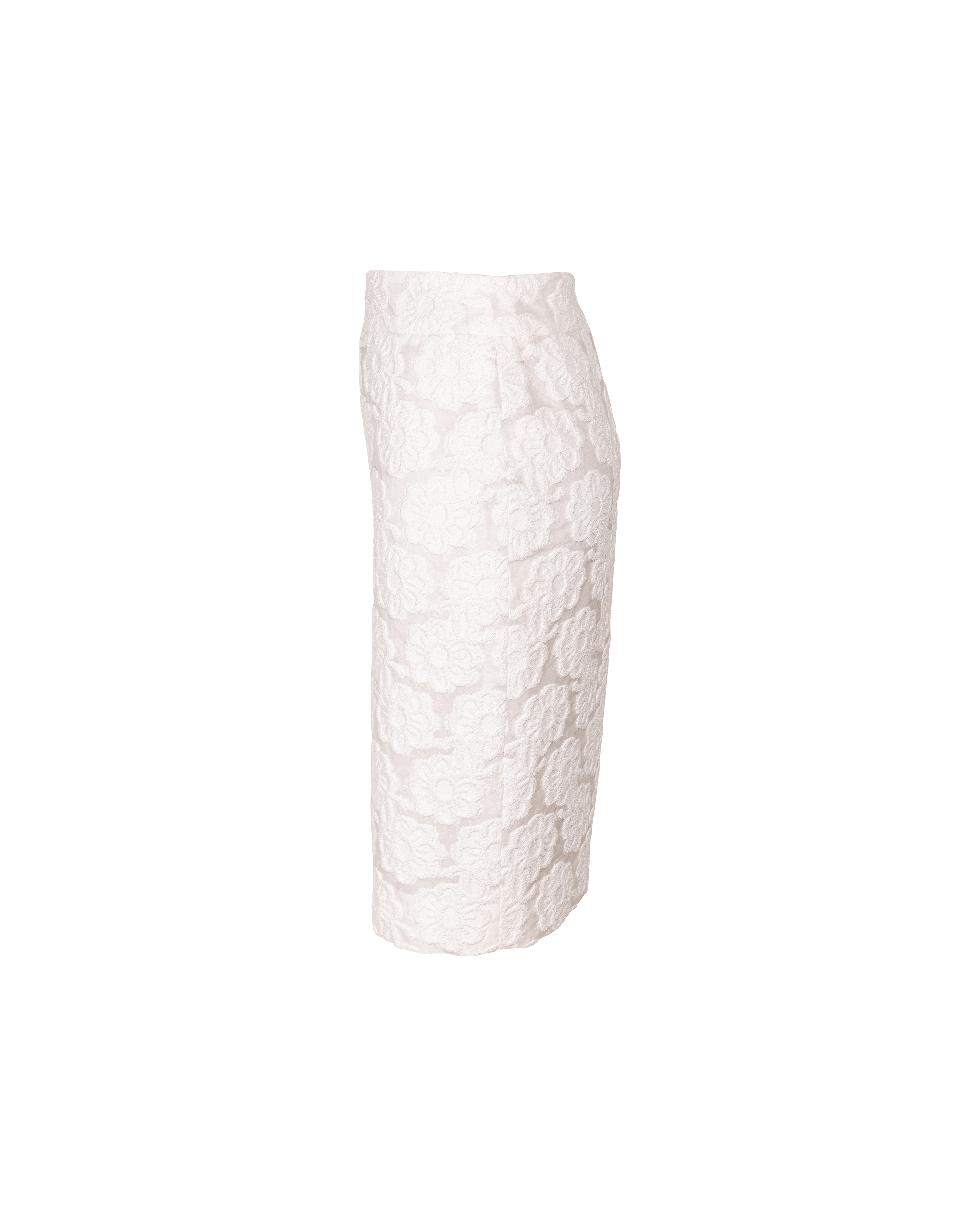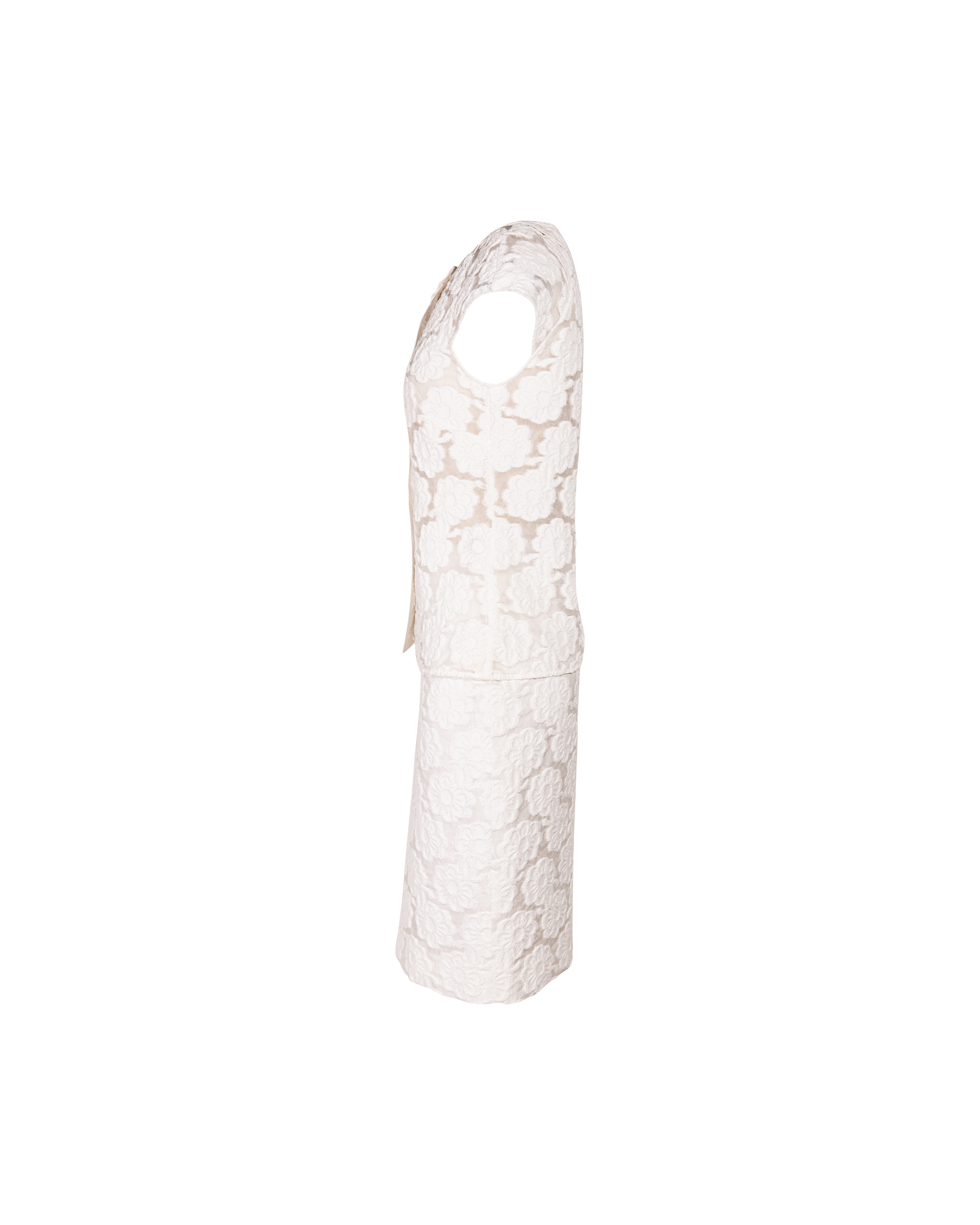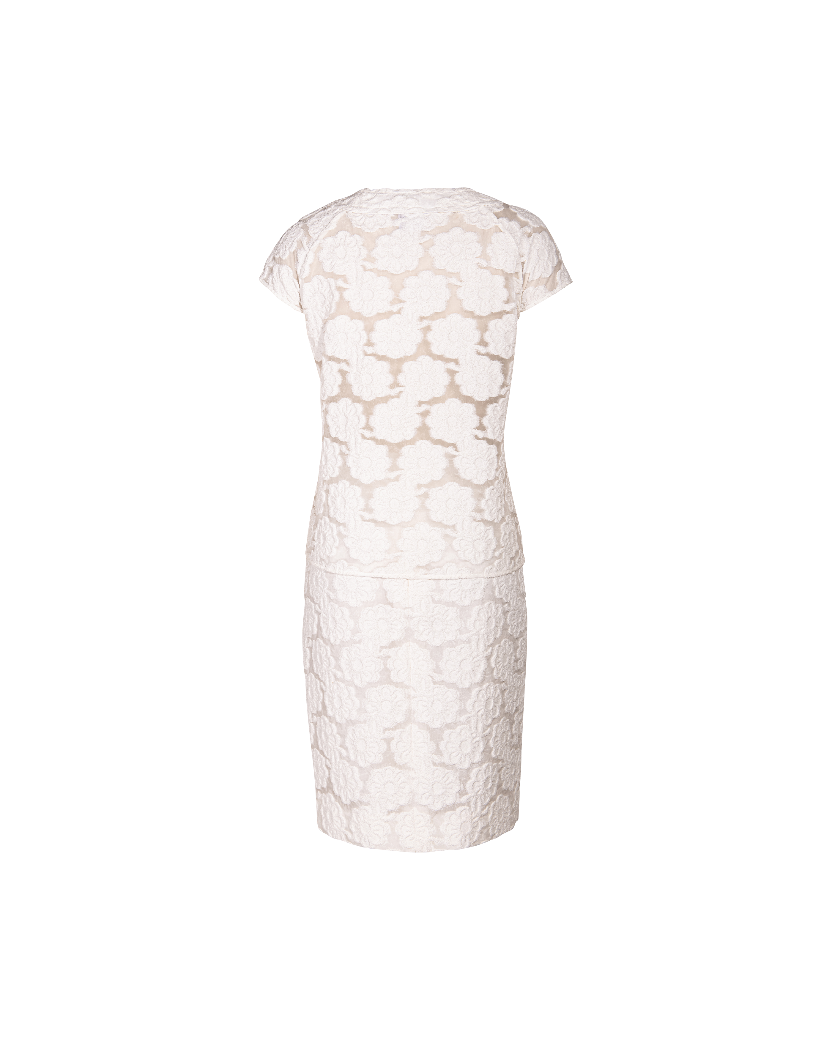 Resort 2009 Chanel by Karl Lagerfeld white camellia floral pattern skirt set. Semi-sheer voided Cotton off-white blend terry cloth with signature Camellia flower pattern throughout skirt and blouse. Cap sleeve button-up blouse features silver-tone circular stamped button closures. Skirt is classic straight style with 'CC' stamped concealed back zip closure. Fabric Contents: 52% Cotton and 48% Nylon blend. Skirt is lined with 100% Silk lining; top is unlined. As seen on the runway (Look 14). In very good vintage condition with light wear throughout, including minor spots near bust and very slight spots throughout sides (not noticeable when worn). Has been taken to couture cleaner and arrives ready to wear.