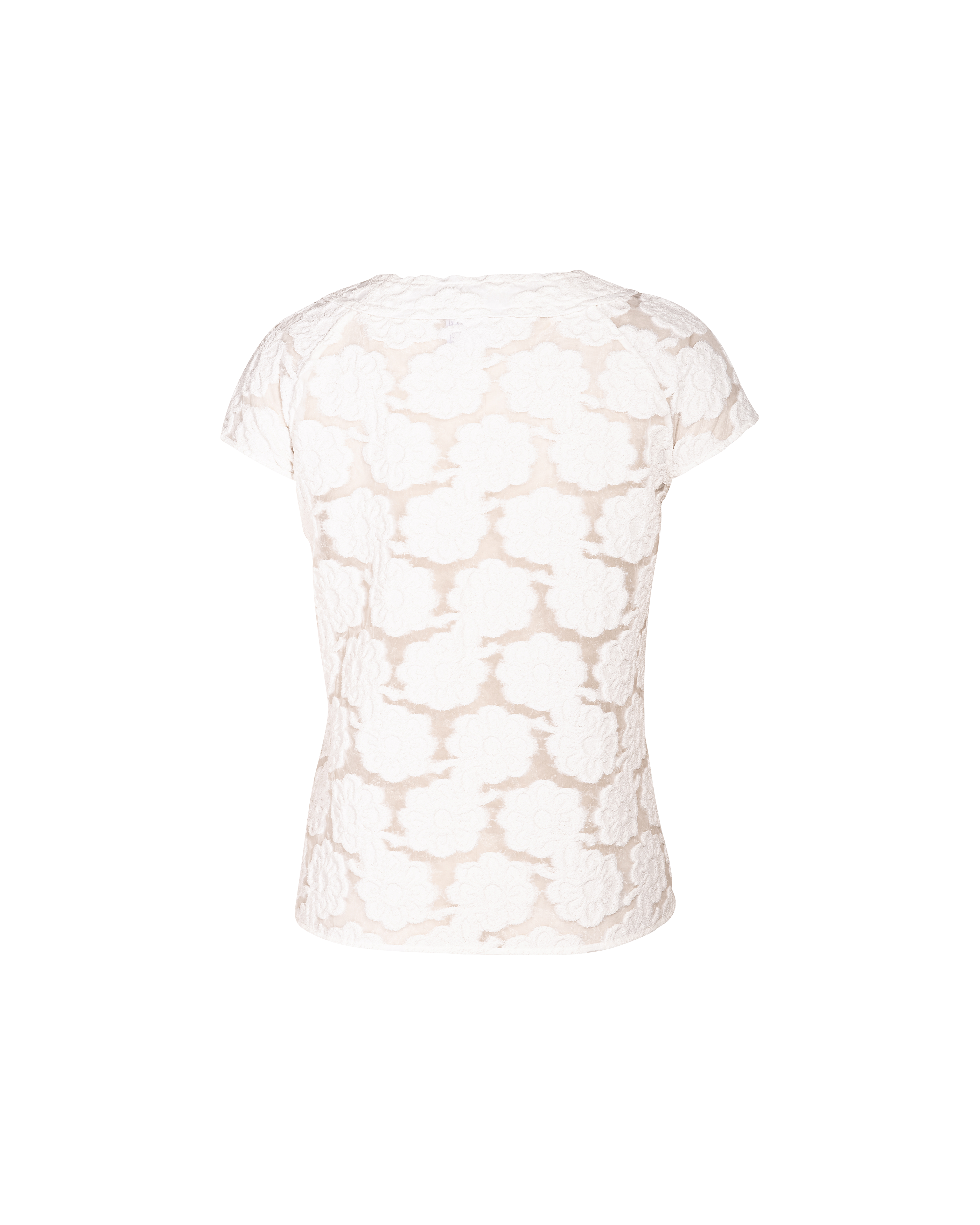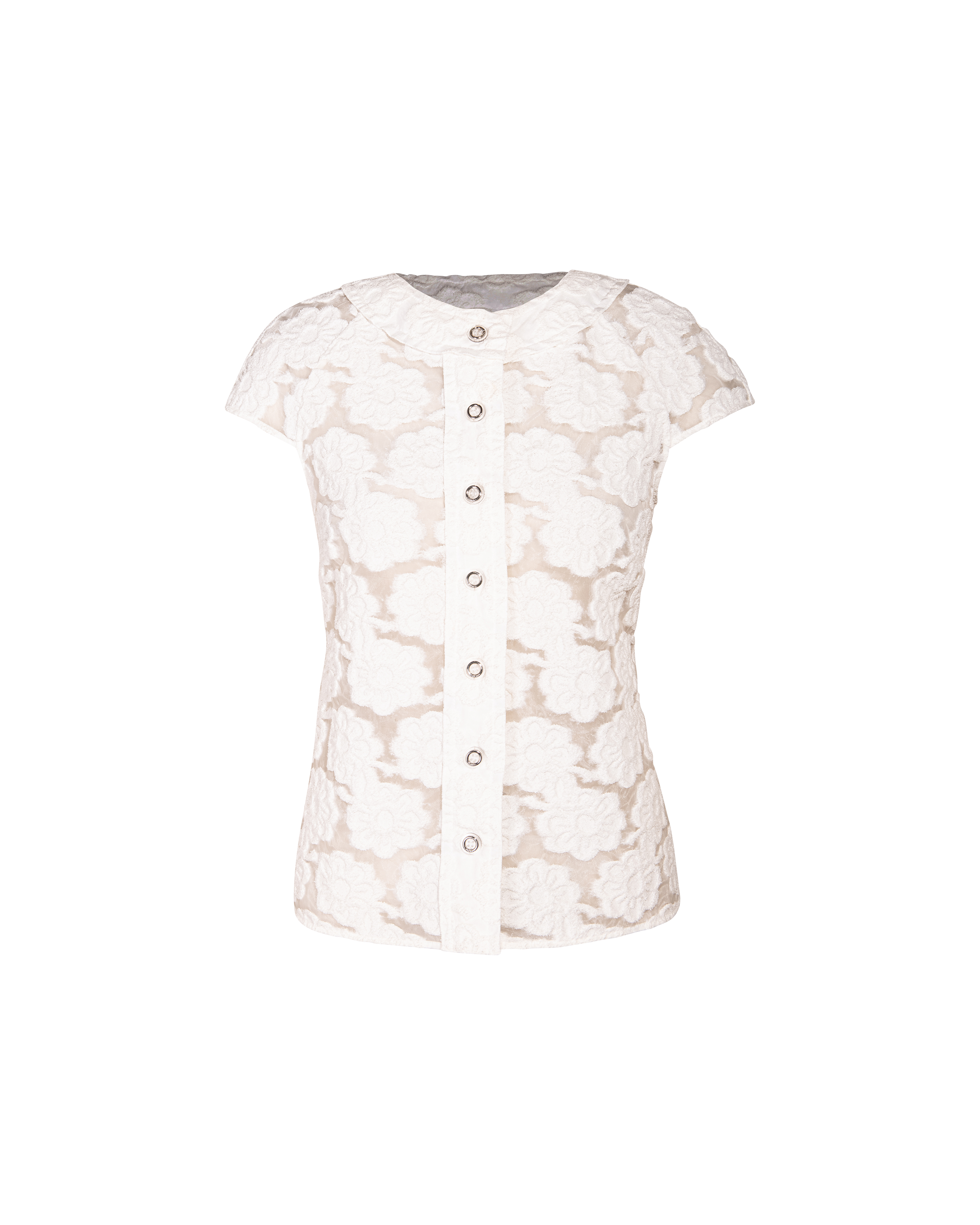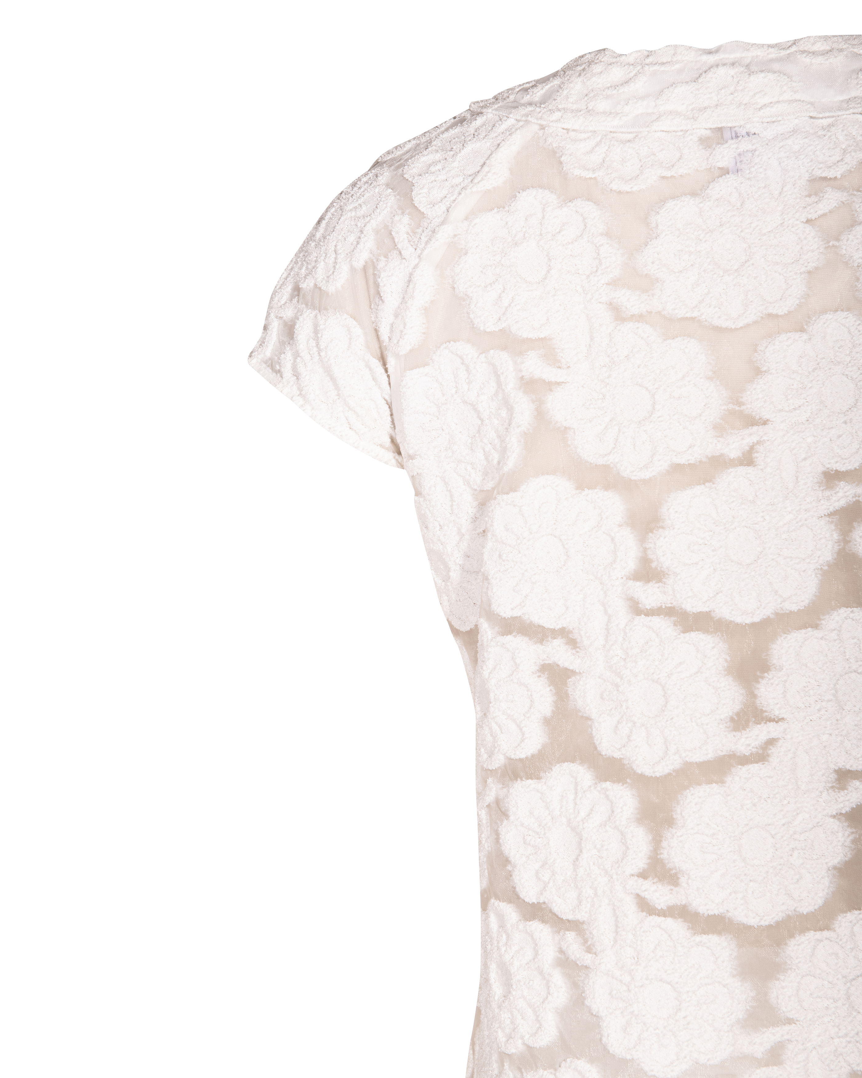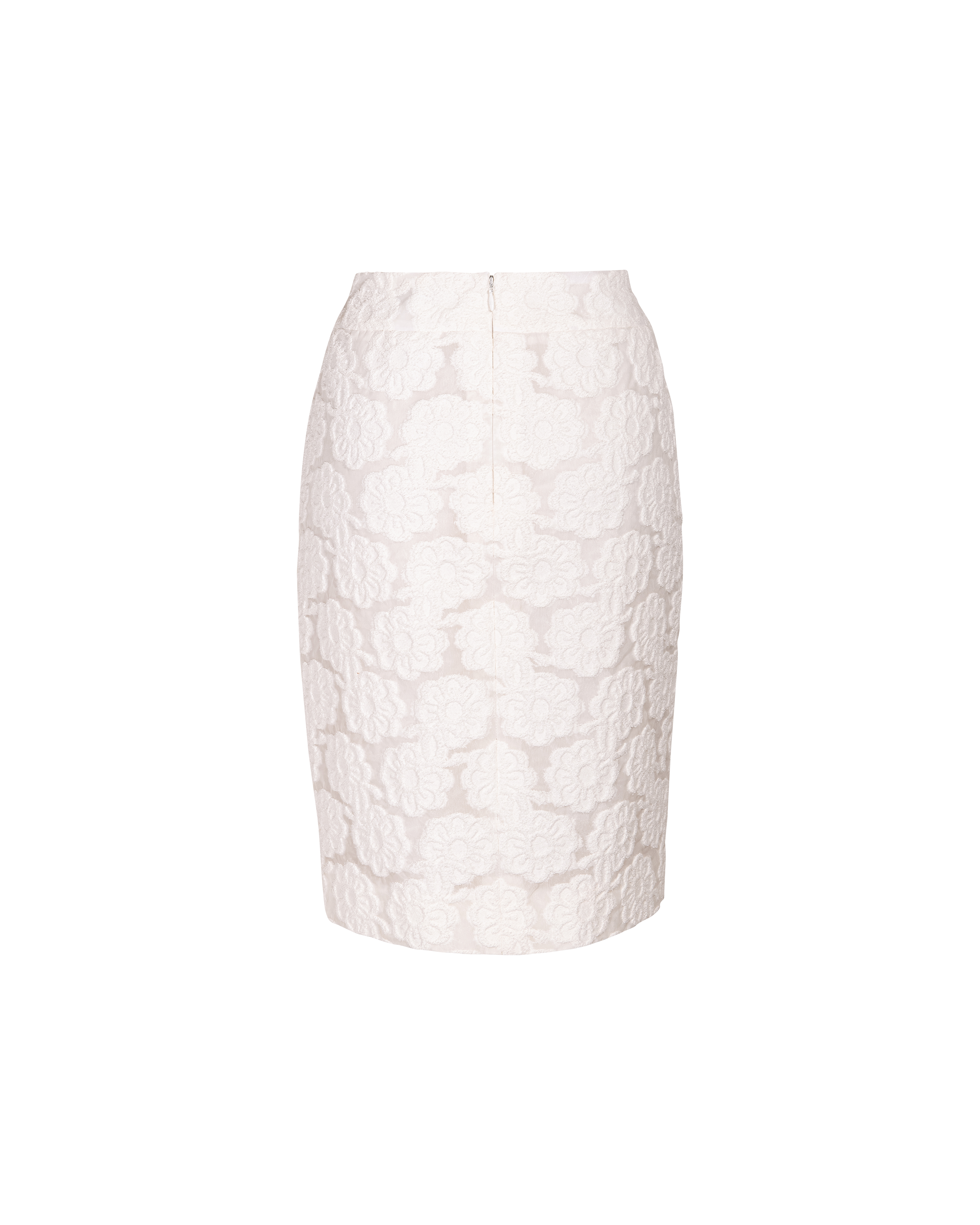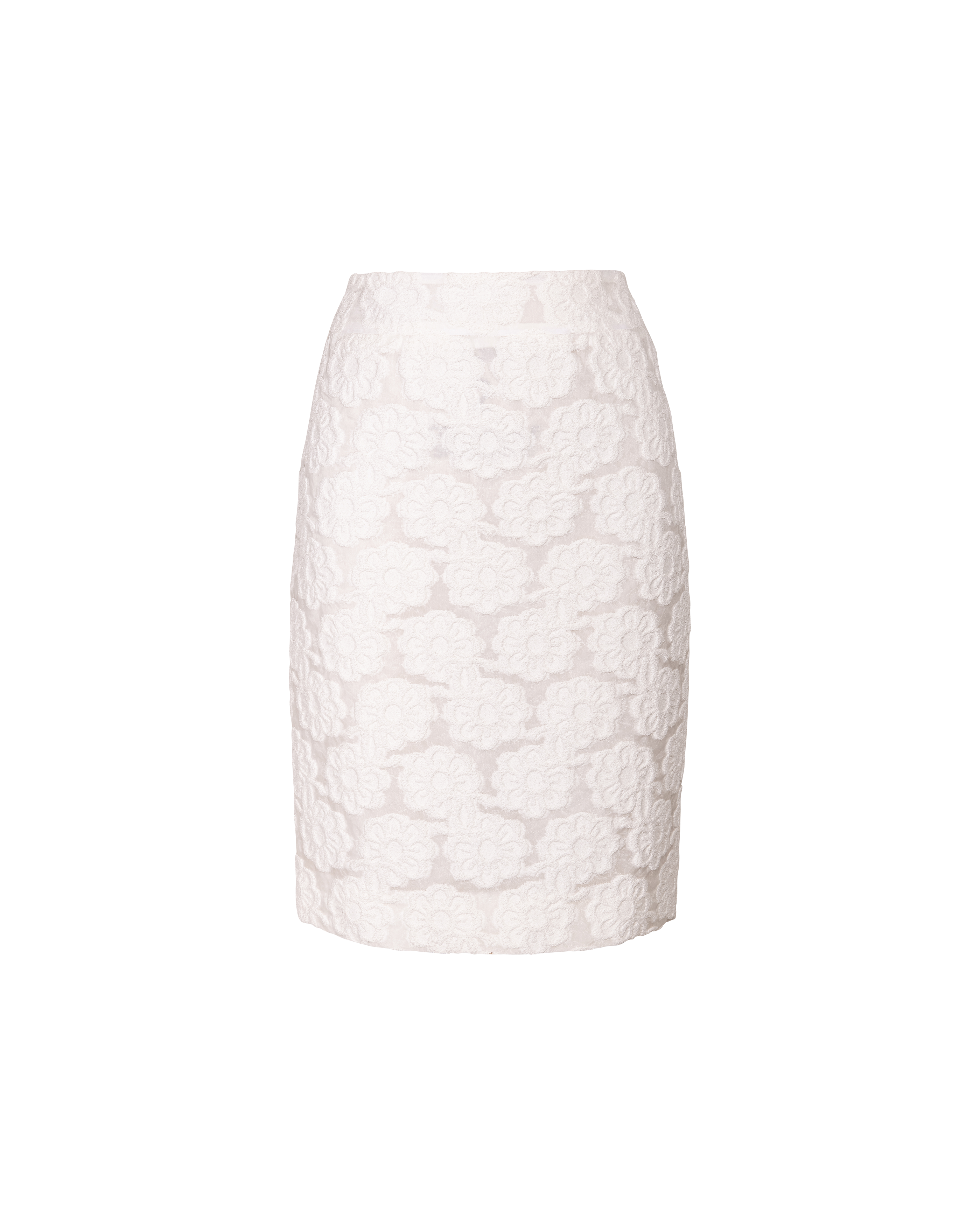 Resort 2009 Chanel by Karl Lagerfeld white camellia floral pattern skirt set. Semi-sheer voided Cotton off-white blend terry cloth with signature Camellia flower pattern throughout skirt and blouse. Cap sleeve button-up blouse features silver-tone circular stamped button closures. Skirt is classic straight style with 'CC' stamped concealed back zip closure. Fabric Contents: 52% Cotton and 48% Nylon blend. Skirt is lined with 100% Silk lining; top is unlined. As seen on the runway (Look 14). In very good vintage condition with light wear throughout, including minor spots near bust and very slight spots throughout sides (not noticeable when worn). Has been taken to couture cleaner and arrives ready to wear.
