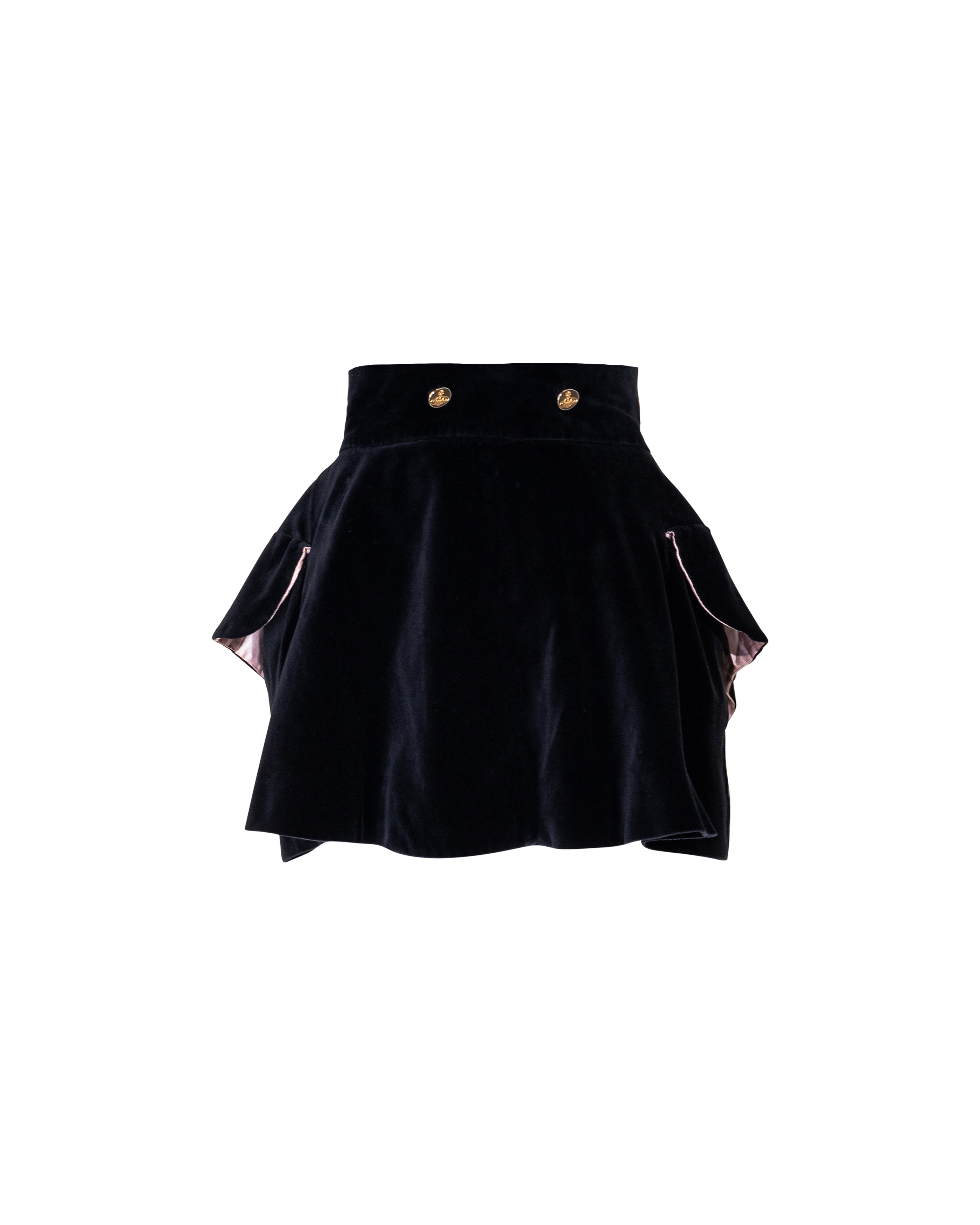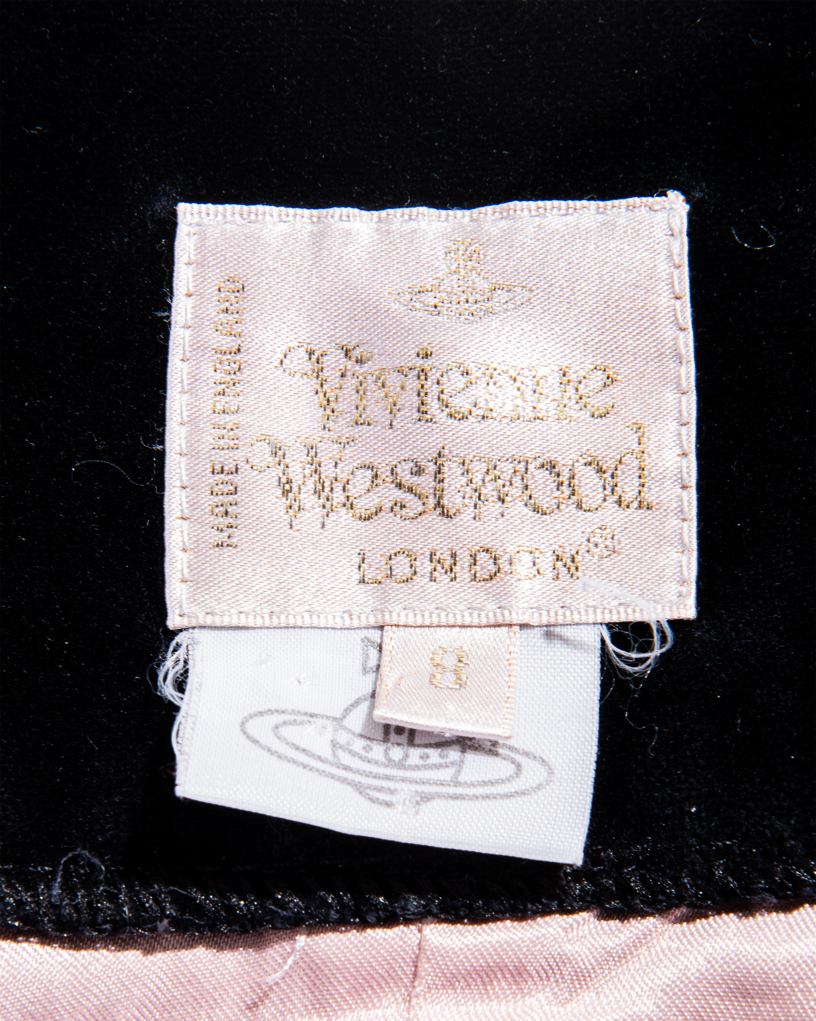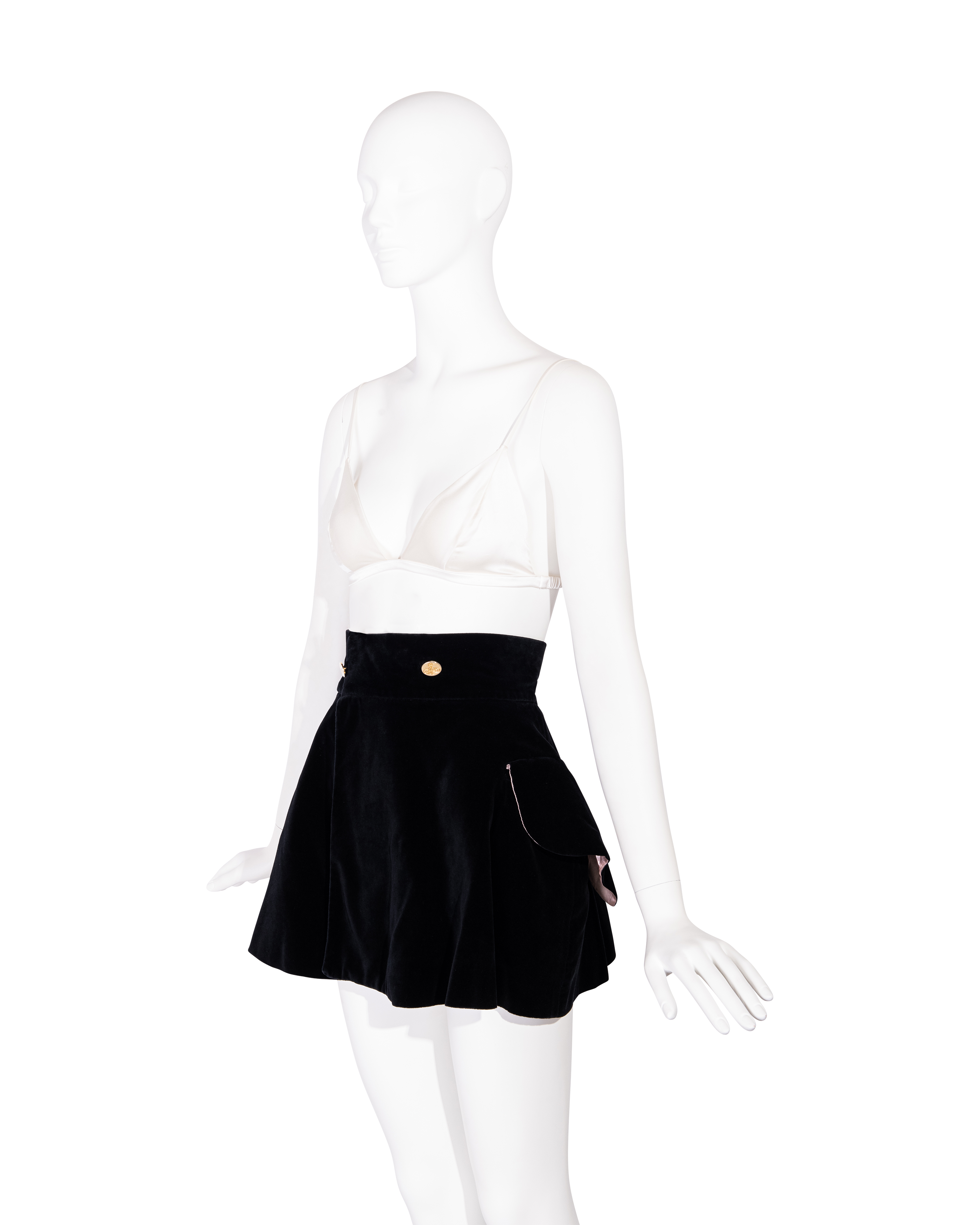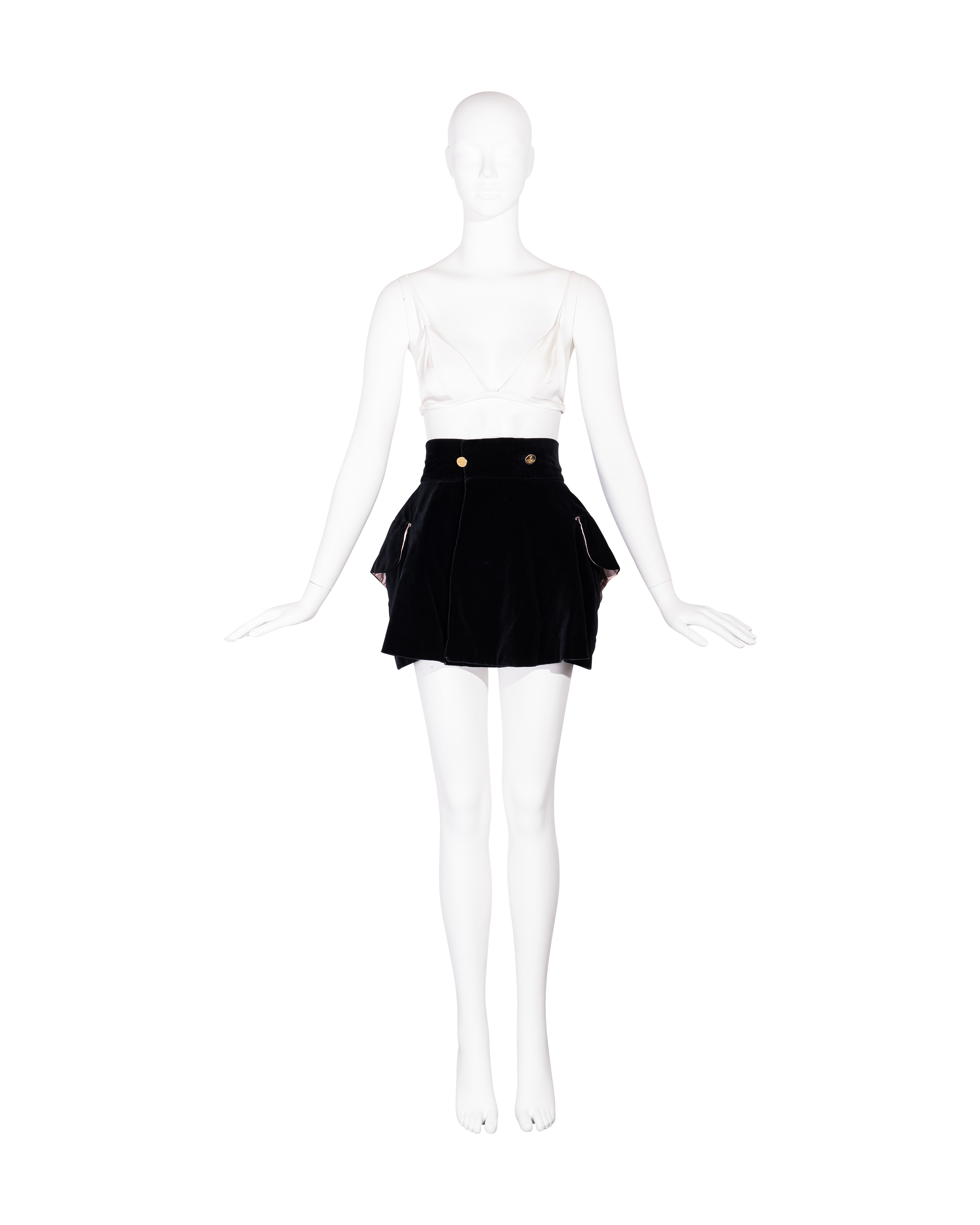 c. 1992 Vivienne Westwood black mini skirt with flap pockets. Small double-breasted black wrap mini skirt with fitted waist and functional side flap pockets, with pale purple interior lining. Gold-tone signature Westwood 'orb' button closures. Fabric Contents: 100% Cotton (velvet) with 100% Acetate lining. In very good vintage condition with light wear throughout. Note that white bra top is used for e-commerce styling purposes only and is not included with purchase.