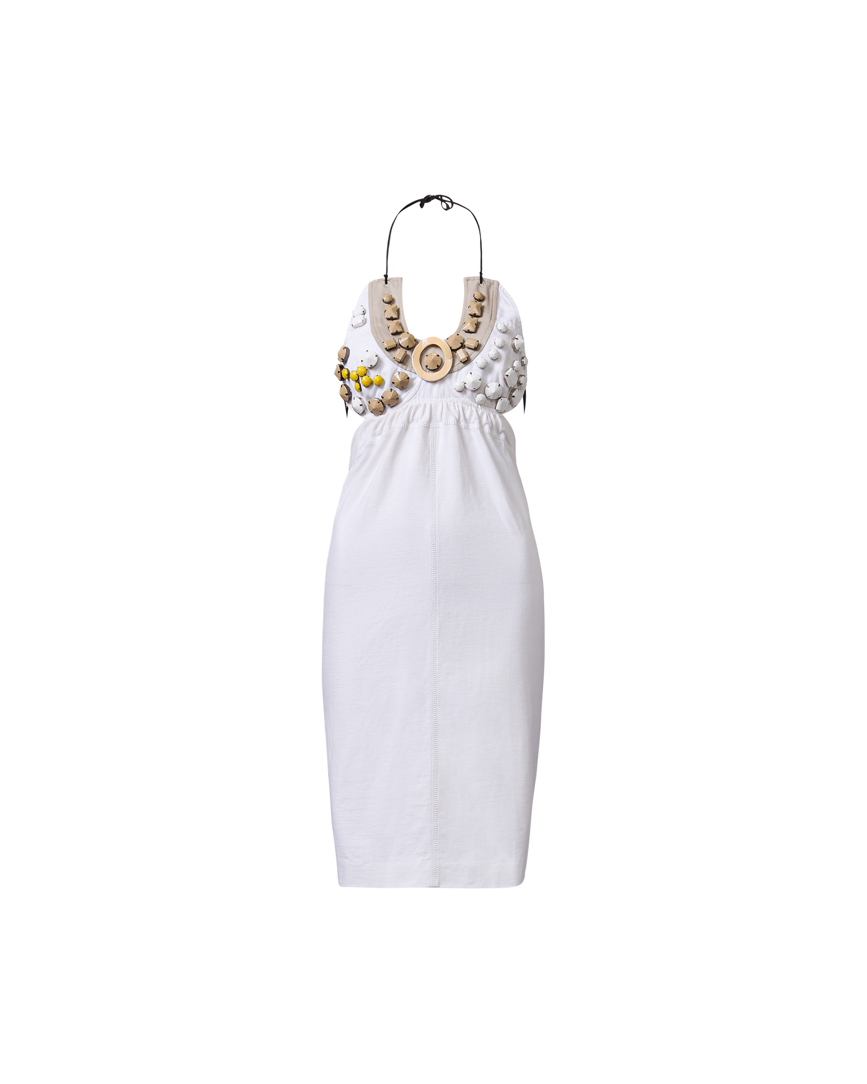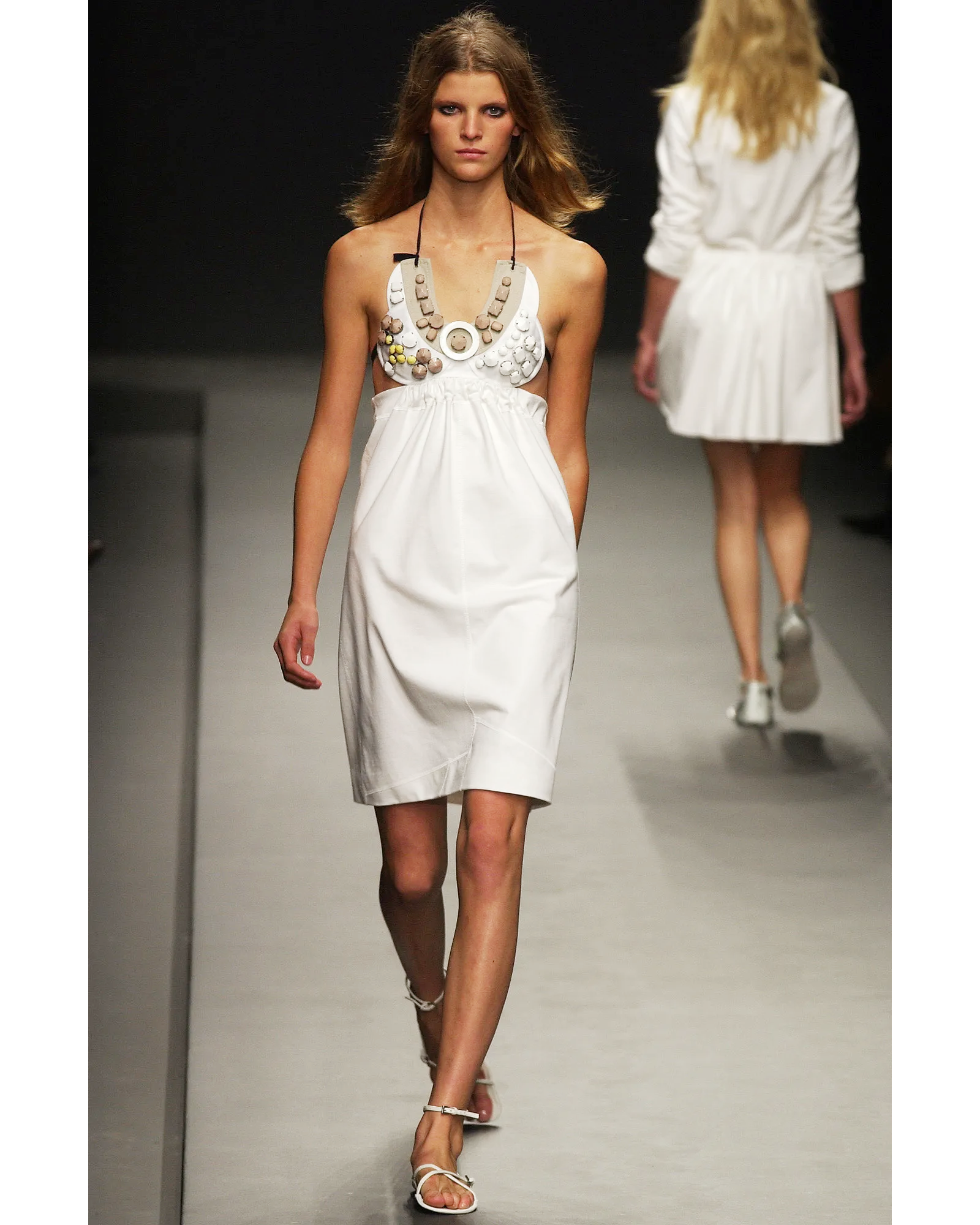 S/S 2003 Prada by Miuccia Prada white above-knee embellished halter dress. Scoop neck halter dress with gathered fitted waist and tan, yellow and white oversized embellishments at bust create cutout breastplate motif. Semi-open back with thin tie strap at nape of neck and thicker grossgrain ribbon tie at waist. Fabric Contents: 100% Cotton. As seen on the runway (Look #37). In very good vintage condition with slight wear at center decal; otherwise has been taken to couture cleaner and arrives in excellent vintage condition.