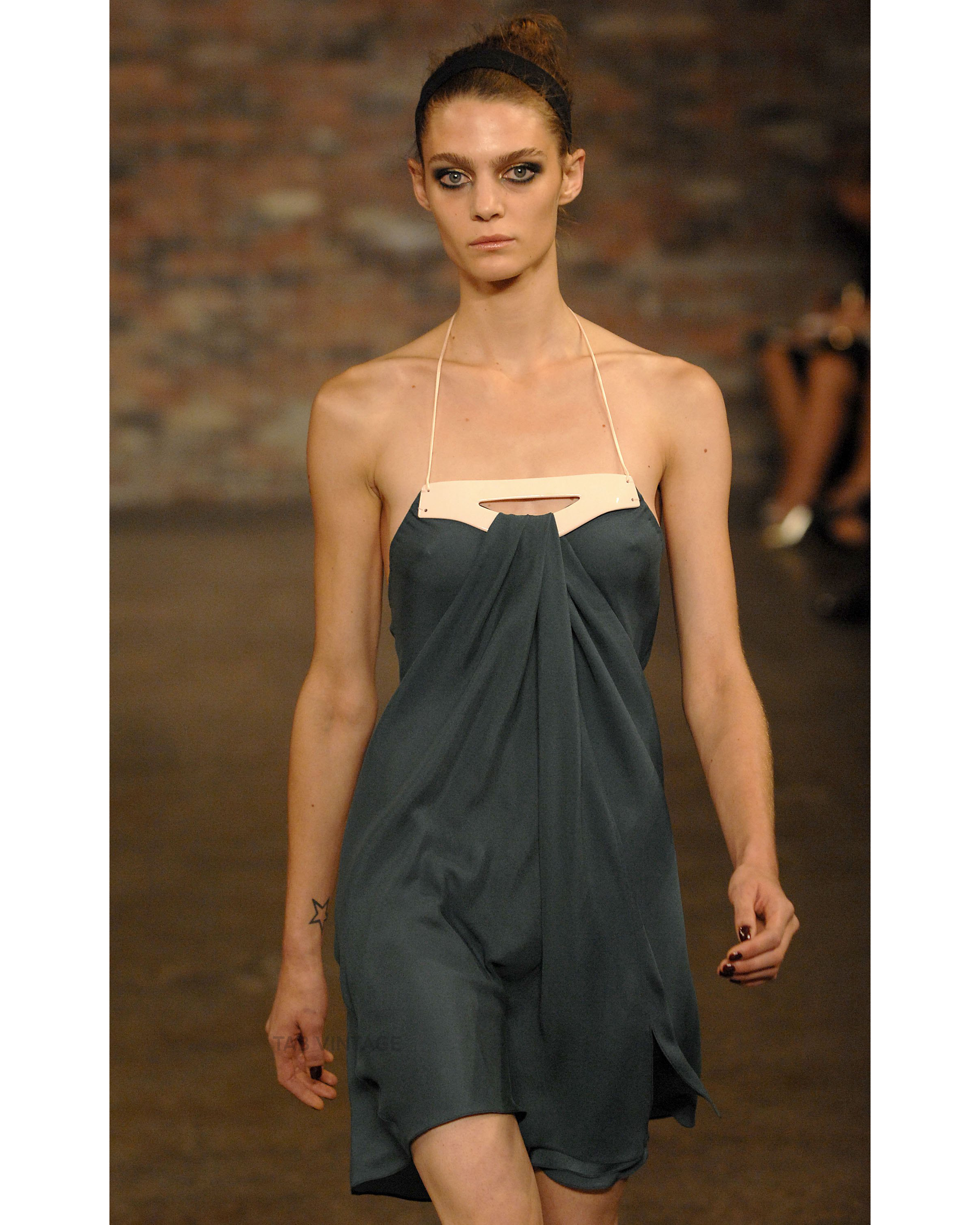 S/S 2007 Narciso Rodriguez deep teal halter dress with resin bustier. Knee length dress that drapes from dusty pink molded resin plate at bust. Semi-open back with hook-and-eye back closures and circle keyhole cutout underneath closures that uniquely exposes skin. Snap and hook-and-eye closure at nape of neck. Fabric Contents: 100% Silk. As seen on the runway on Marina Peres (Look #35). In very good vintage condition with small spot at interior of halter strap that is unnoticeable when worn. Otherwise new with original tags.