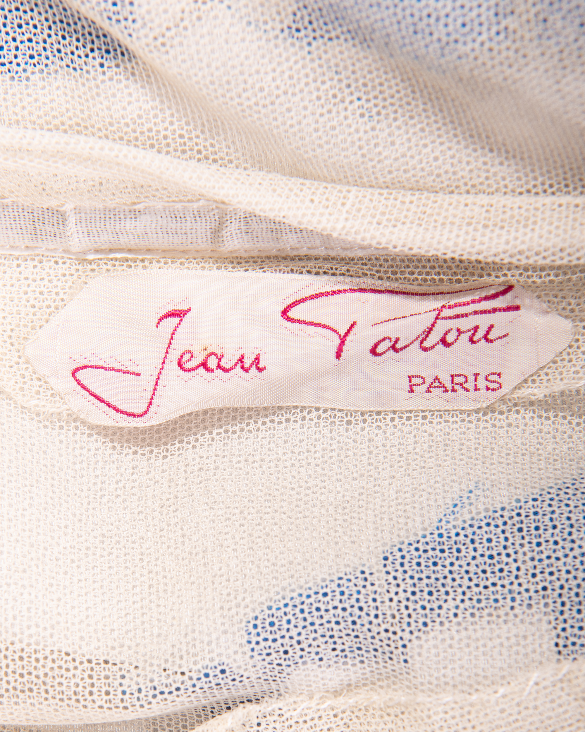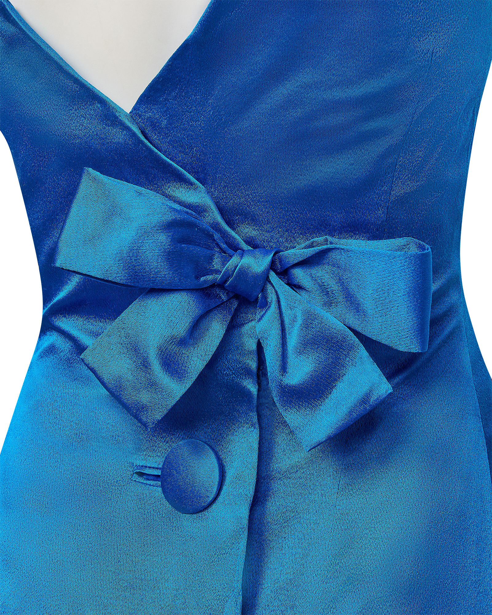 c. 1959 Jean Patou Couture by Karl Lagerfeld strapless blue silk evening sheath gown. Matching oversized fabric buttons and bow at back. Built-in nude mesh corset with boning and back zip closure. Subtle wrap-like effect at back with cross-over at side-back. In as-is vintage condition with light wear throughout interior corset, and slight tear at side seam at hem (visible when worn; would require repair with tailor).