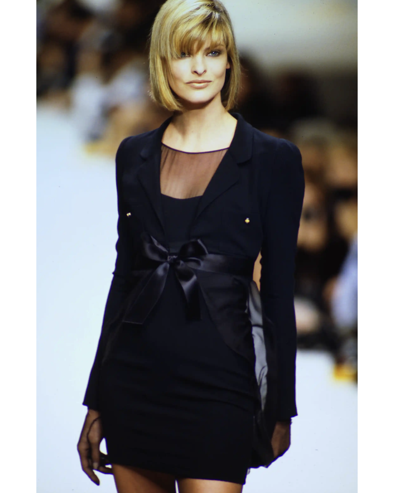 S/S 1994 Chanel by Karl Lagerfeld Haute Couture black mini dress and jacket set. Sleeveless black mini dress with semi-sheer black crinkle chiffon paneling above bust. Concealed back zip closure, with two black and gold 'CC' logo buttons at back detailing. Fully lined with silk lining. Pairs with long sleeve contrasting wool upper and semi-sheer silk chiffon lower paneled coat with matching black and gold-tone 'CC' buttons. Silk chiffon is slightly asymmetrical at hemline (longer at left side). Silk ribbon tie closure underneath bust. Gold-tone button detailing at wrist (7 functional buttons with stamped 'Chanel' interior). Rare one-of-one look as seen on the runway on Linda Evangelista. In very good vintage condition with light wear at mesh paneling.