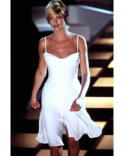 S/S 1996 Gianni Versace ivory pleated bustier mini dress. Sleeveless mini dress with pleated bustier and fabric button-front closures. Contrasting off-white / ivory upper and ecru skirting. Fabric Contents: 59% Viscose, 33% Silk, 6% Polyamide, and 2% Elastane blend. Concealed back zip closure, with additional built-in corsetlet with boning at sides that has zipper closure at interior. As seen on the runway (Look #22) on Linda Evangelista and featured on Amber Valletta in the ad campaign. In very good vintage condition with small spot at right side bust, faint spot at hemline, and pin-sized spot at side near waist (visible only upon close inspection).