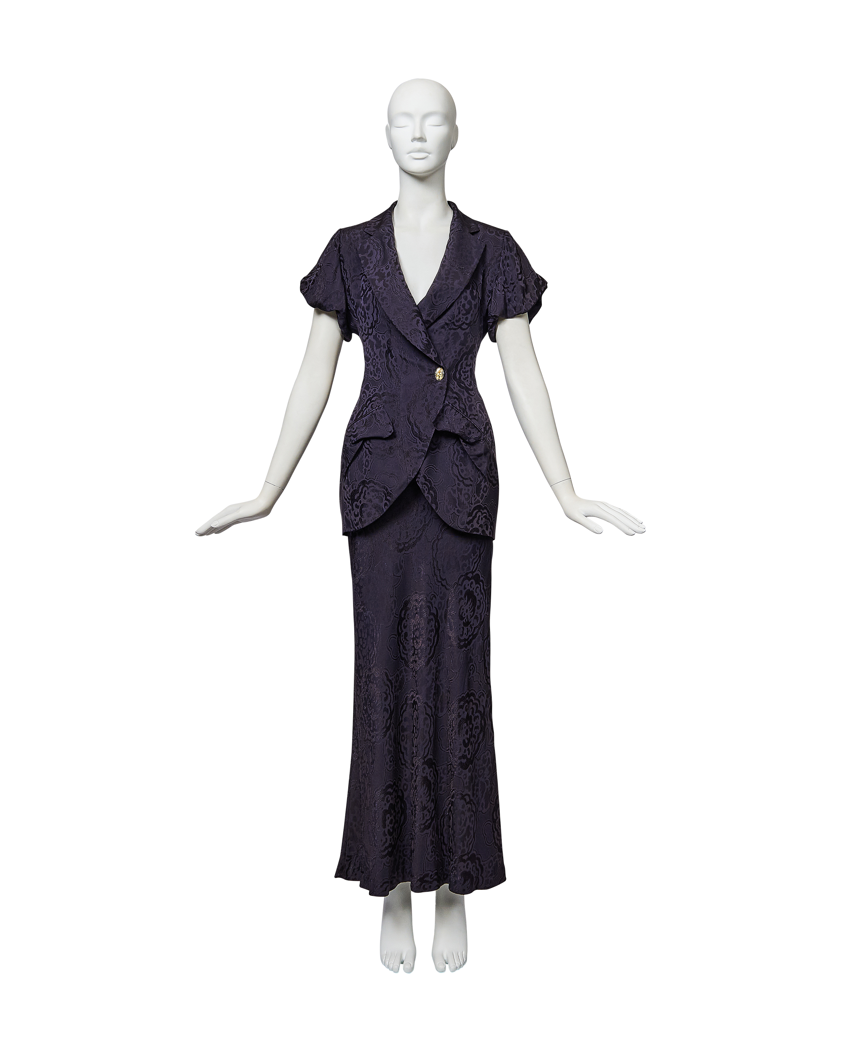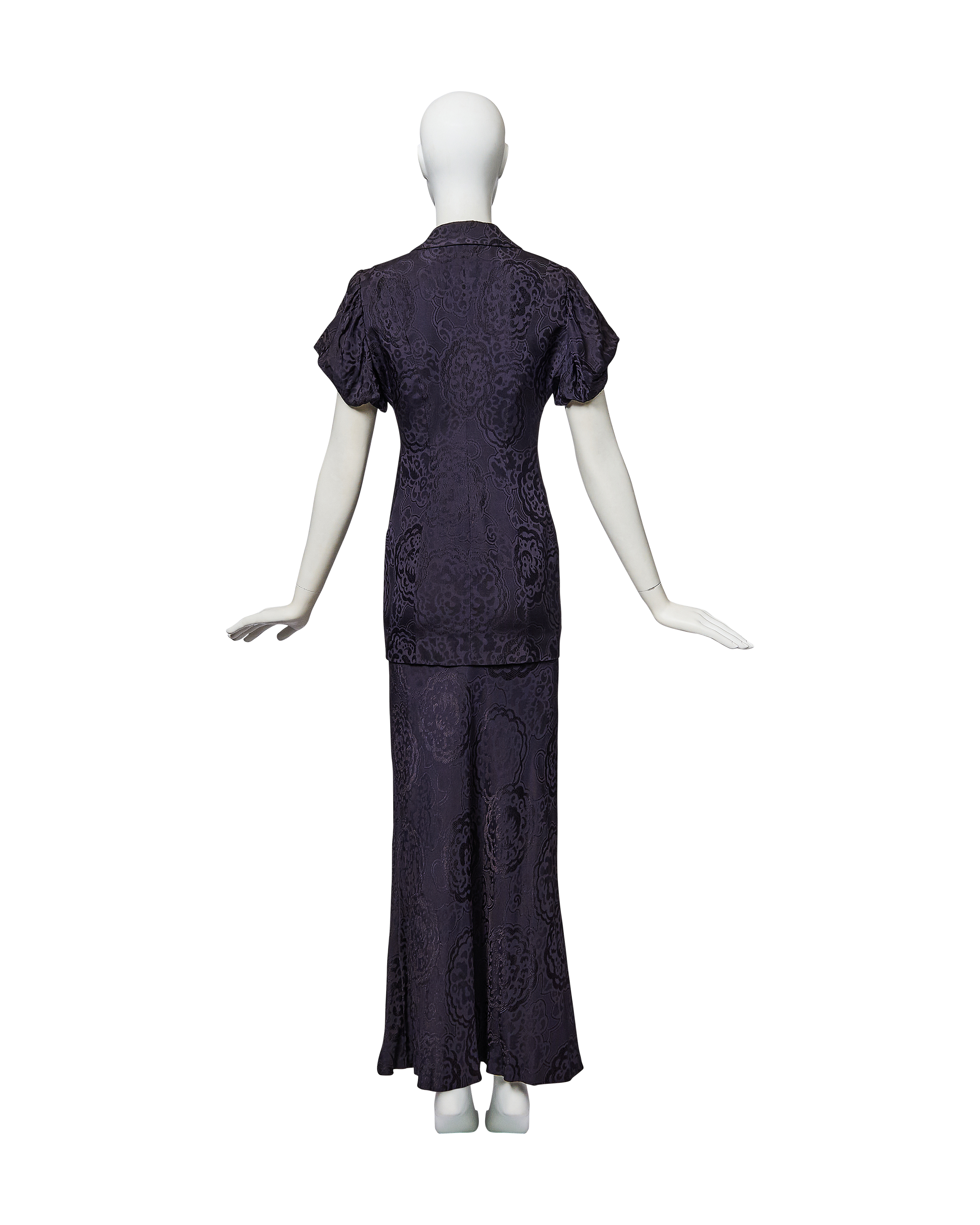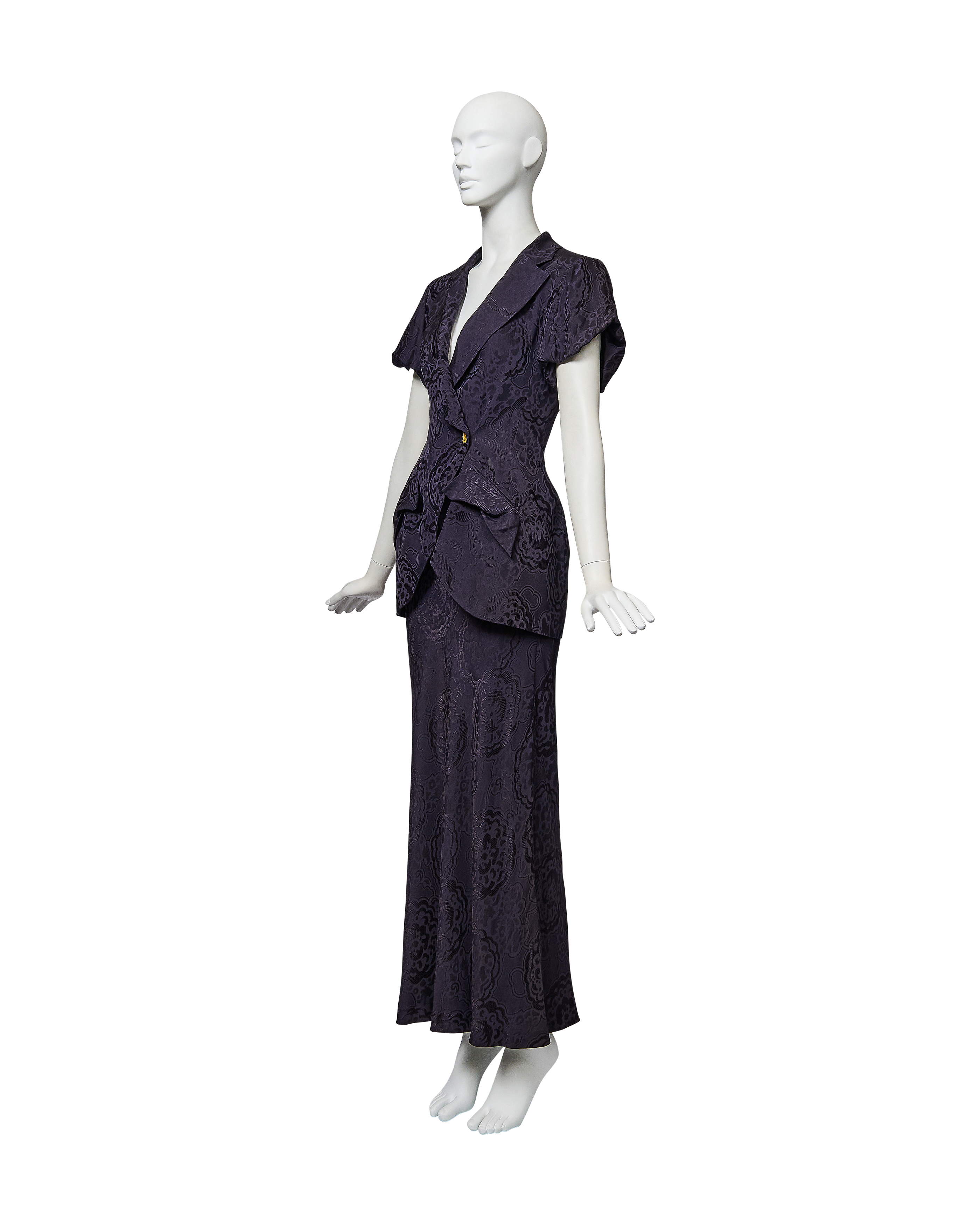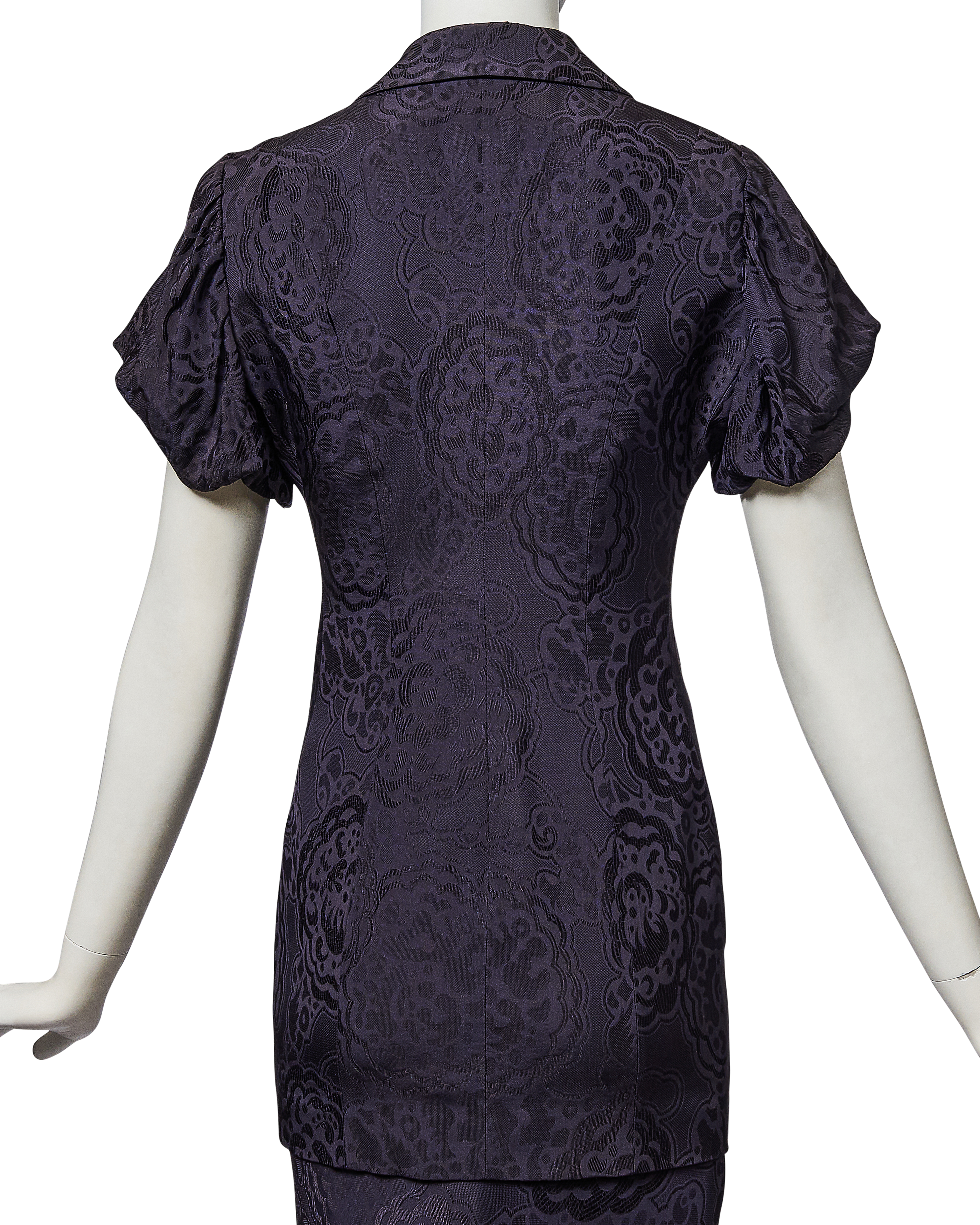 S/S 1999 Deep Purple Brocade Pattern Short Sleeve Jacket and Maxi Skirt Set