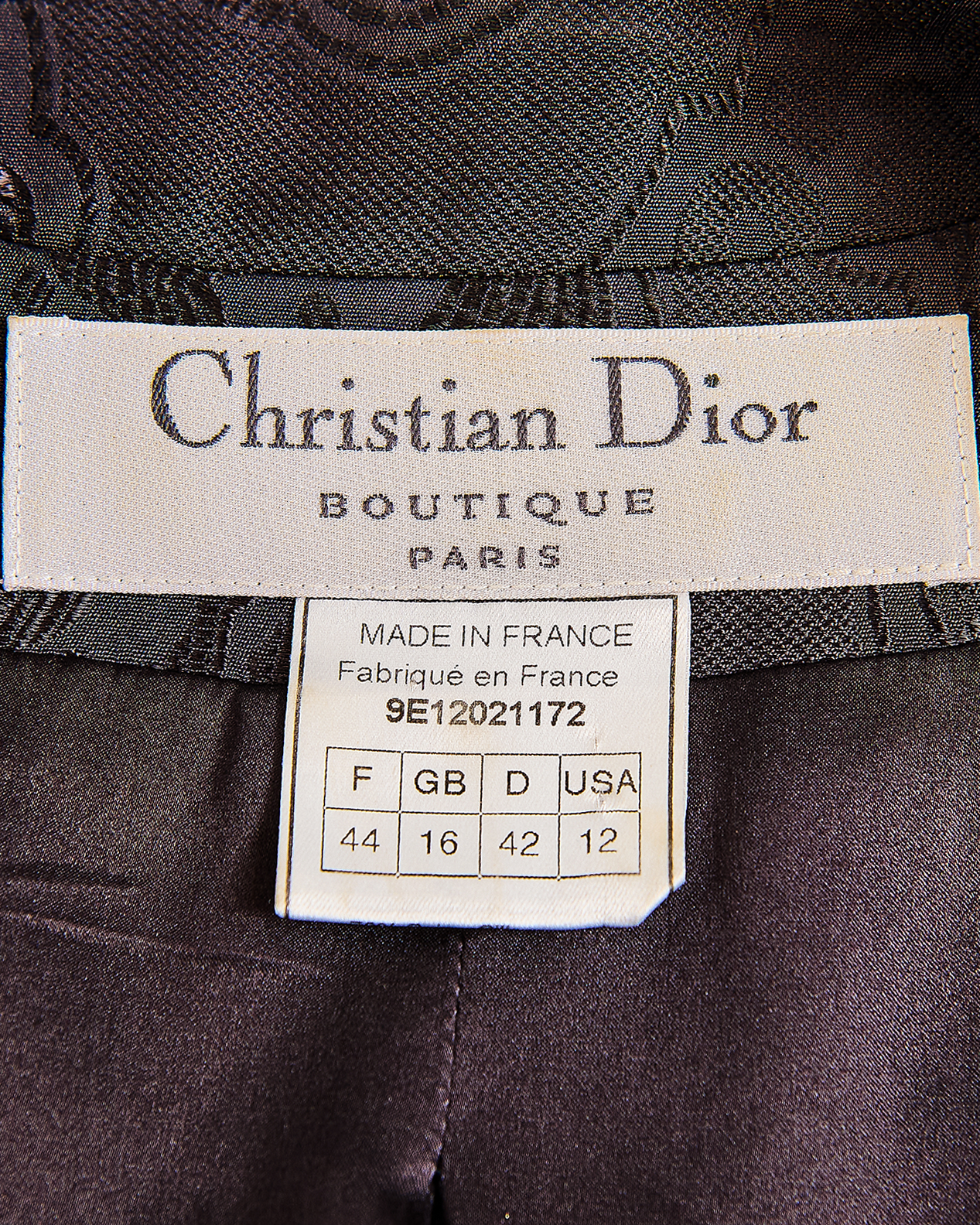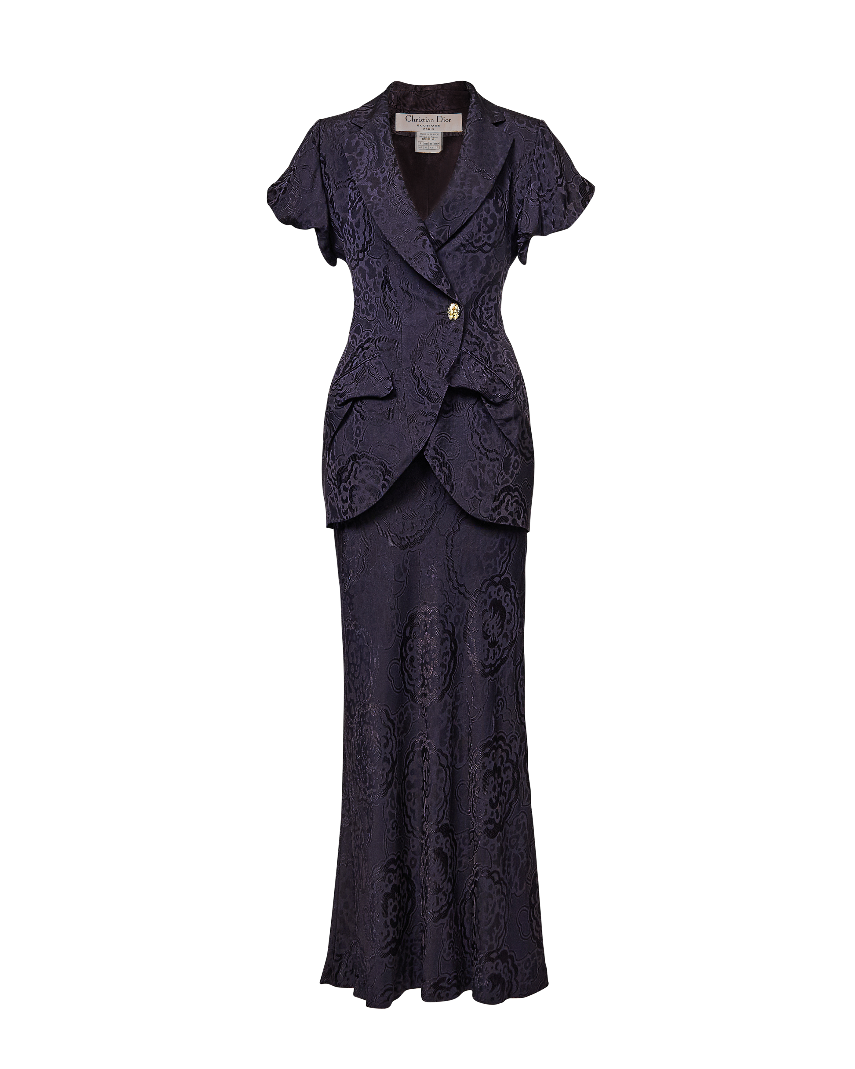 S/S 1999 Christian Dior by John Galliano deep eggplant purple brocade pattern short sleeve jacket and maxi skirt set. Collared short sleeve jacket / top with inverted front flap pockets with distinct 'v' tacked shape. Rare gunmetal button closure with real tan pressed flower and yellow color interior. Pairs with matching bias cut maxi skirt, featuring abstract floral pattern throughout. Skirt has elastic waistband and no additional closures. Fabric Contents: 76% Silk and 24% Viscose blend with 100% Silk lining. Pattern and silhouette as seen on the runway. In very good vintage condition with slightly loose seams at interior (unnoticeable when worn) and light pulling throughout that is noticeable only upon very close inspection.